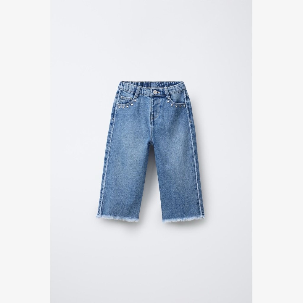 Culotte jeans with an elastic waistband and front snap-button fastening. Front pockets with heart appliqués, patch pockets on the back