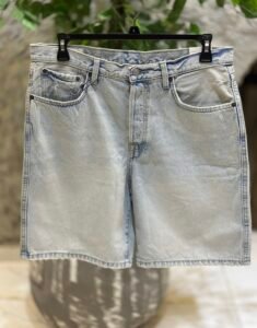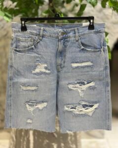 Cotton denim baggy fit Bermuda shorts. Five pockets. Faded effect. Irregular hem. Zip fly and button fastening. Style: 4048/309/800
