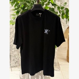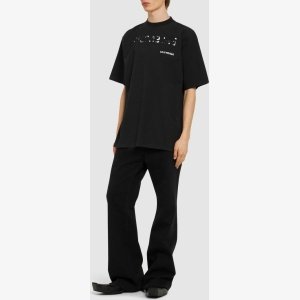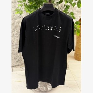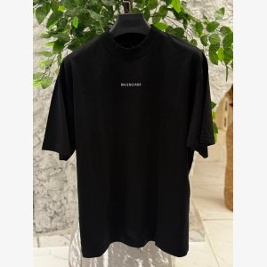 Design: A sleek black base with a subtle white “BALENCIAGA” logo centered on the chest and back of the t-shirt. Fit: Typically