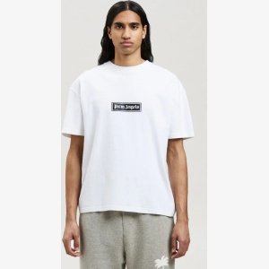 The t-shirt features a black rectangular logo with the brand name “Palm Angels” in a white, Gothic-style font on the