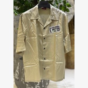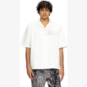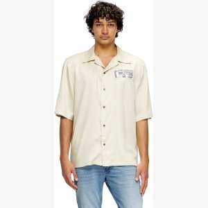 Part of an artistic collab, this men’s beige bowling shirt is a fusion of medieval inspo and modern creativity: note