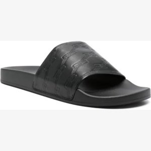 Boasting a debossed monogram across the wide toe strap, these pool slides by Balenciaga in all-black, smooth calf leather are