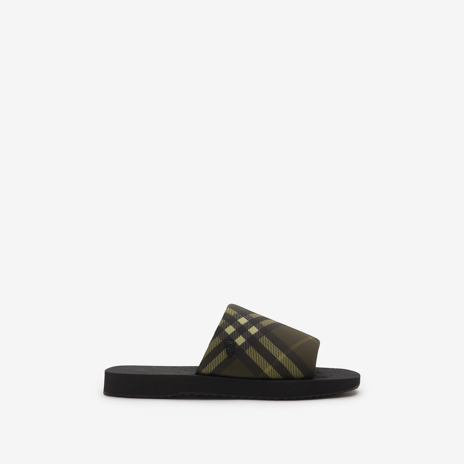 A pair of Check Trek slides showcasing a padded design and signature check pattern. Designed for effortless wear with a slip-on style, they feature a logo patch on the side for a branded touch. The round toe and cushioned footbed ensure comfort, while the logo-detailed sole adds a distinctive finish.