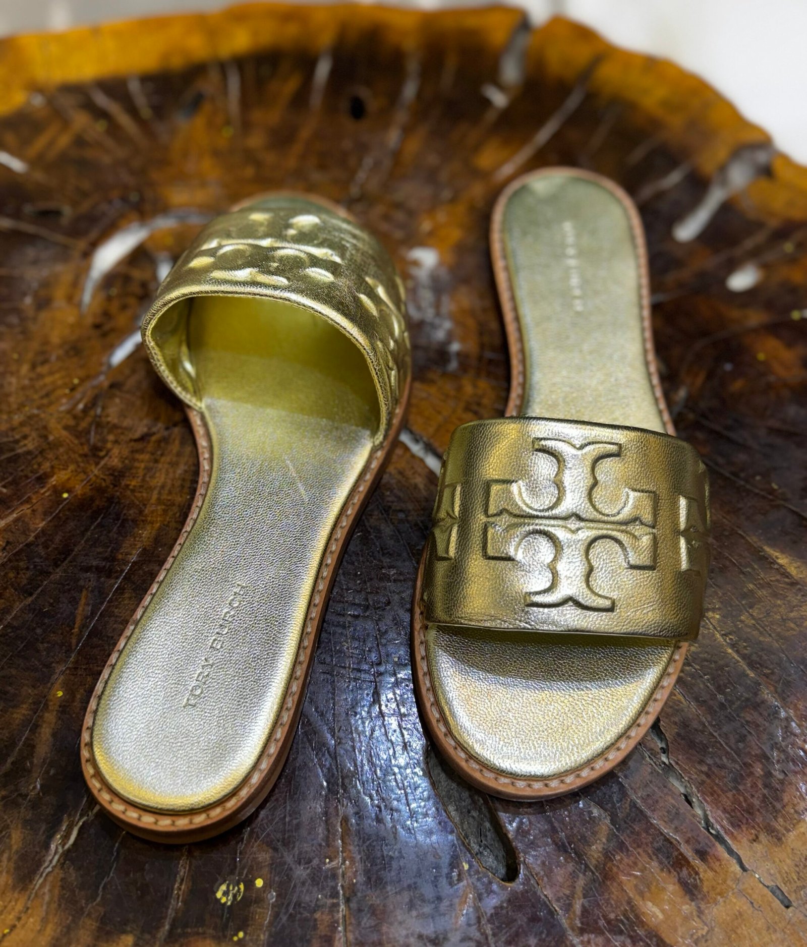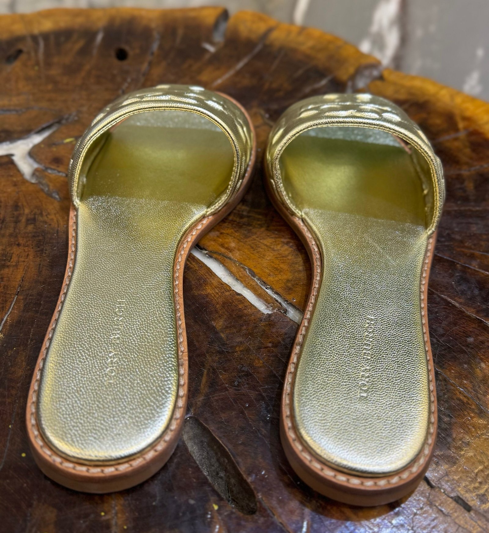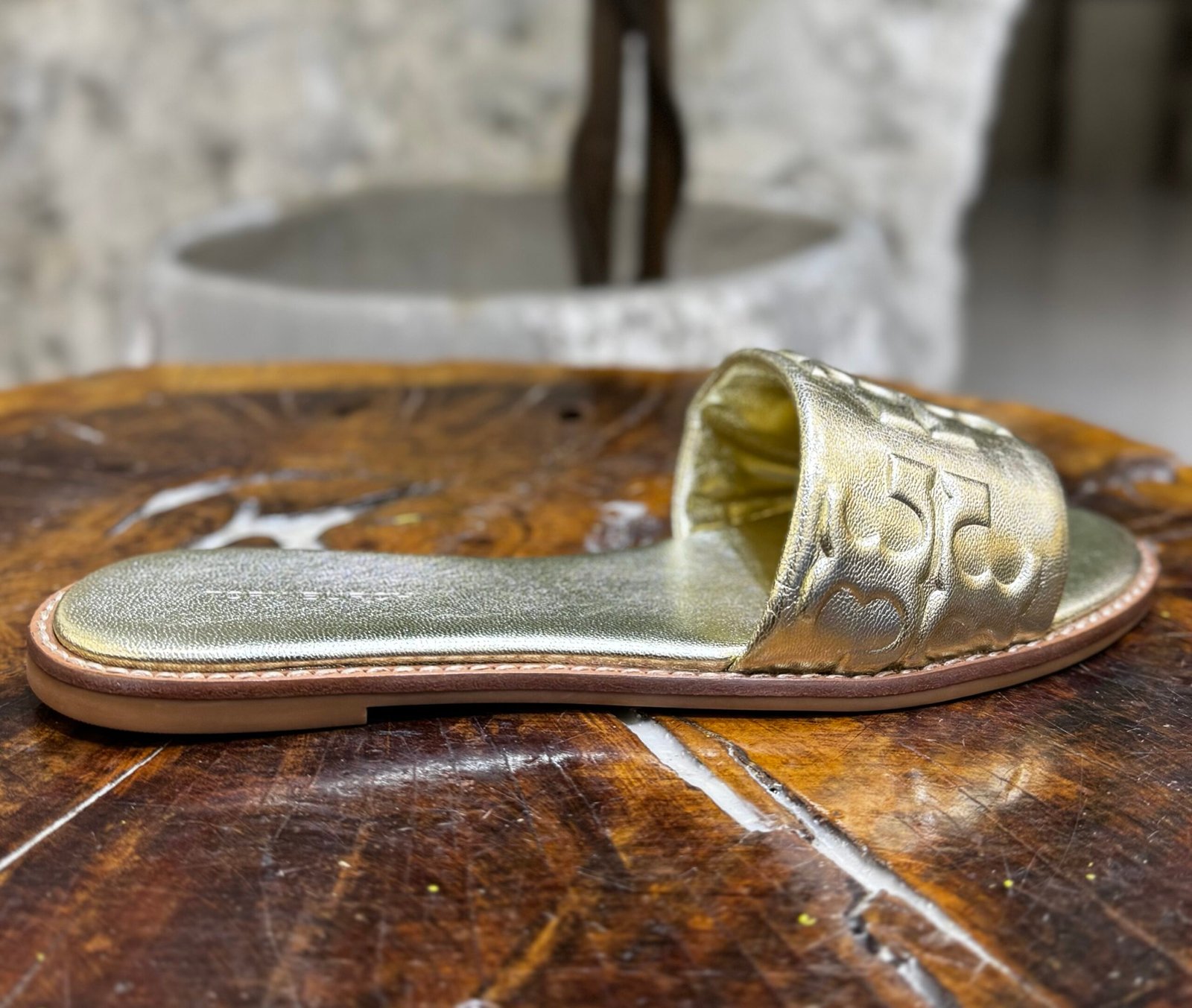 - Design: A flat, slip-on style featuring a wide metallic leather strap.