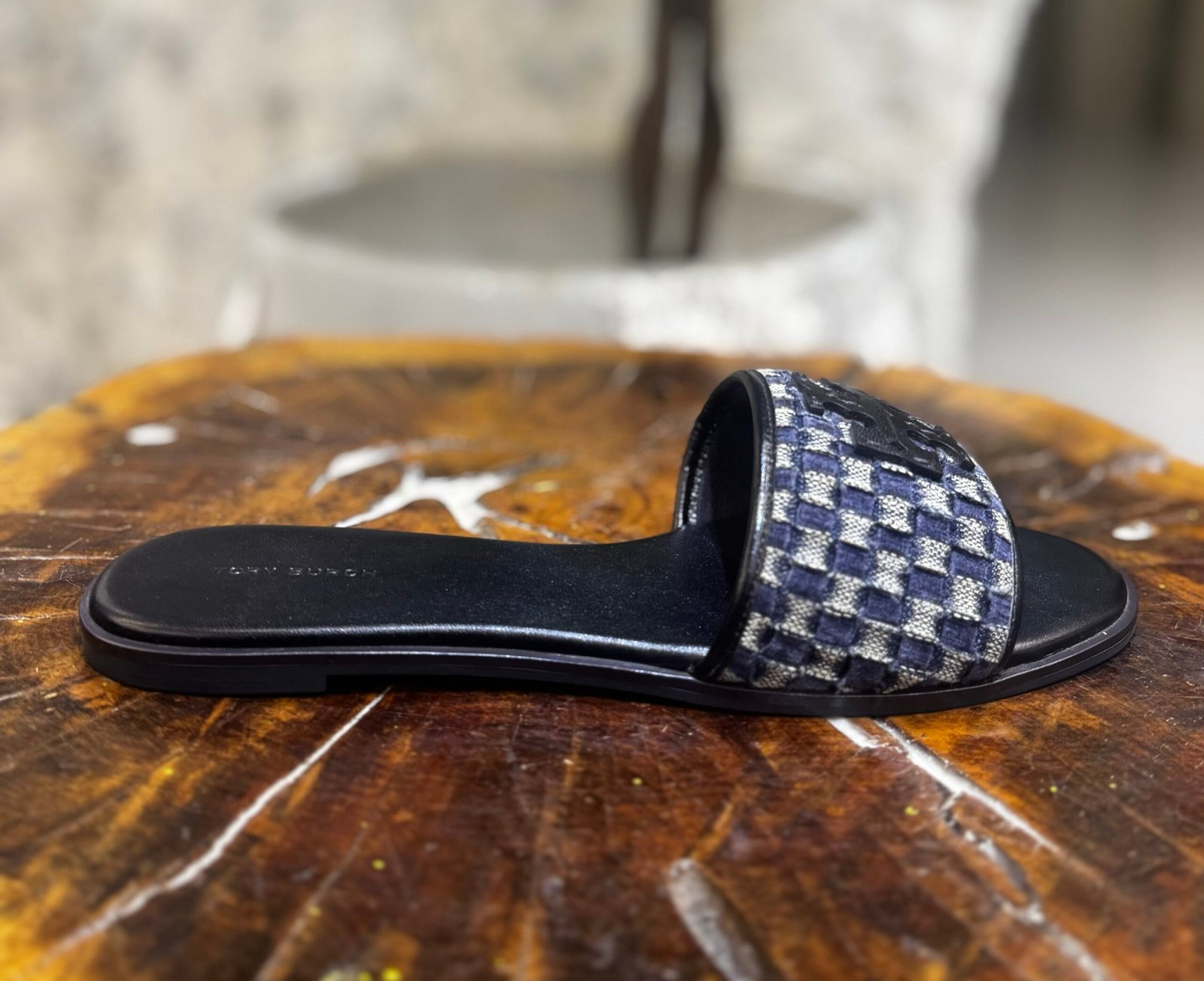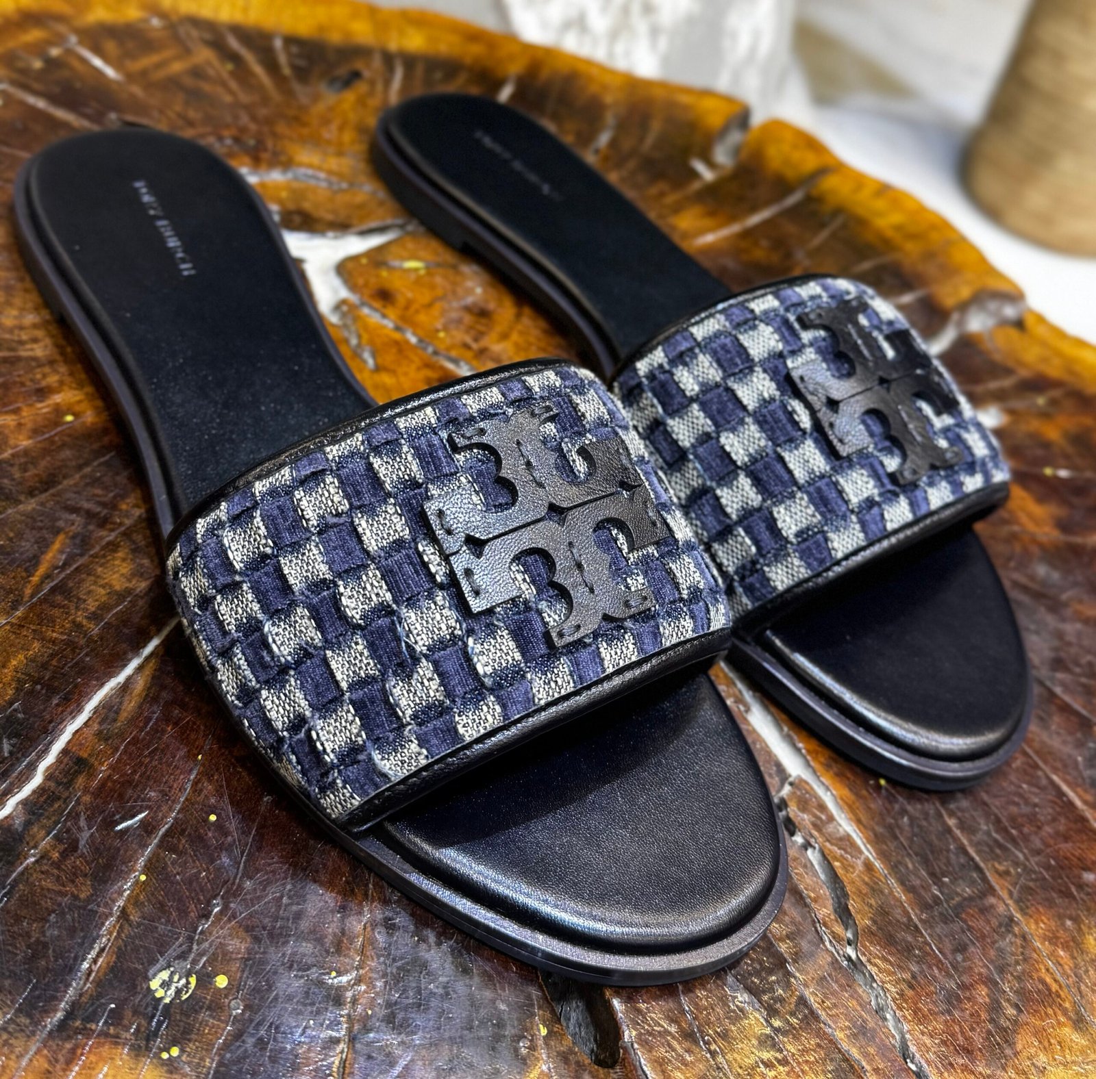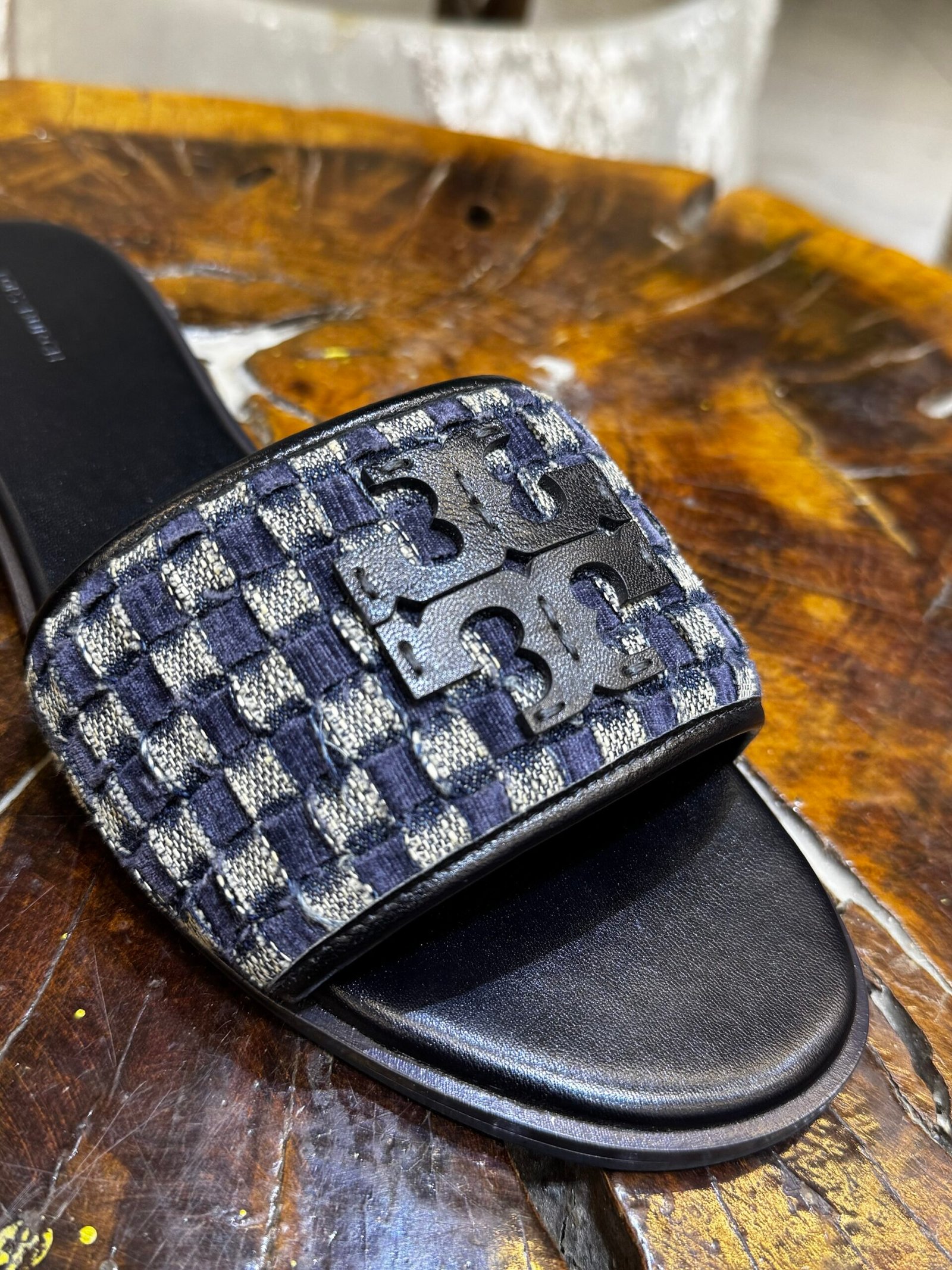They feature a navy and light blue checkered pattern made from braided velvet and denim, accented with a black leather Double T logo plaque