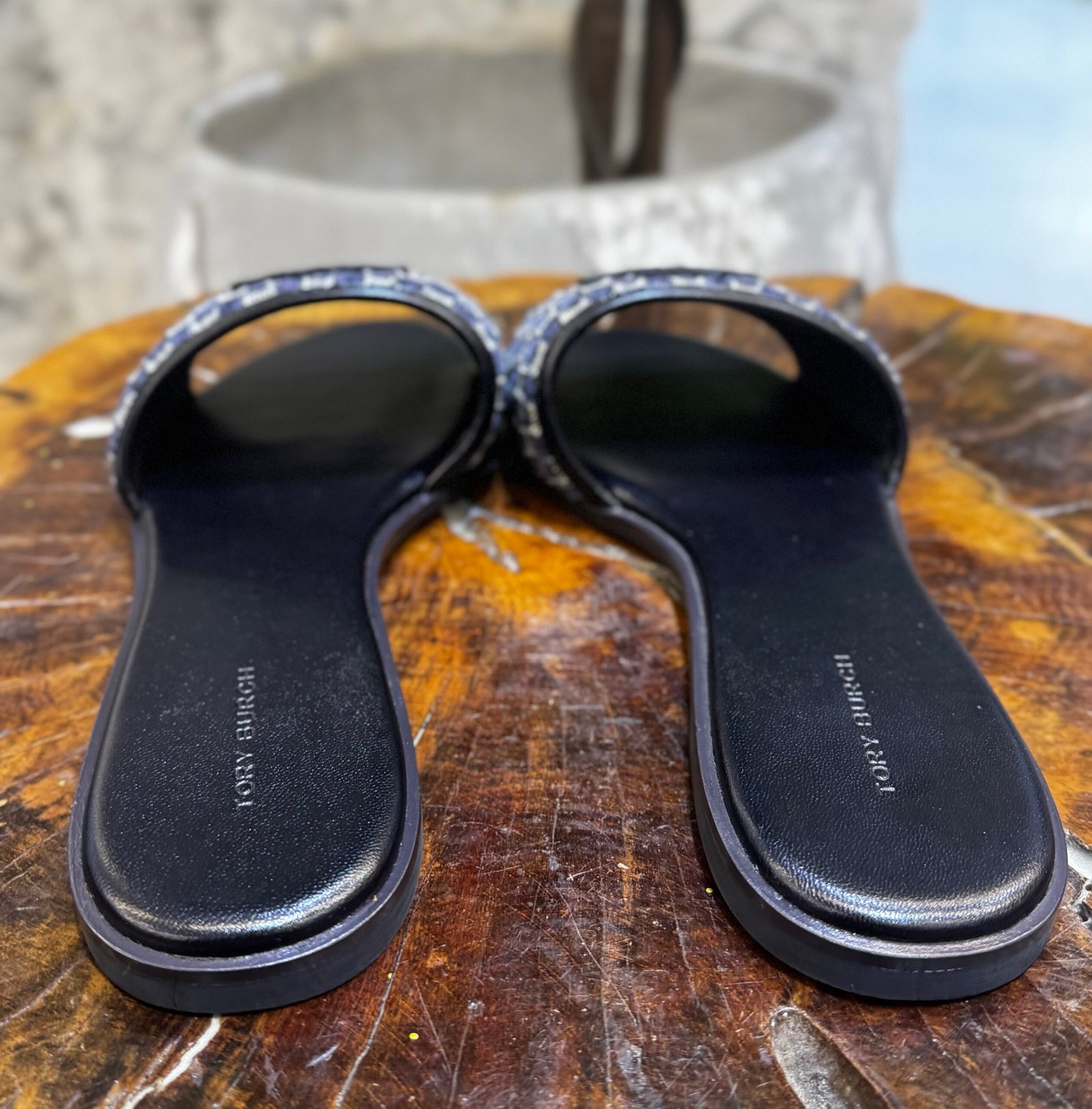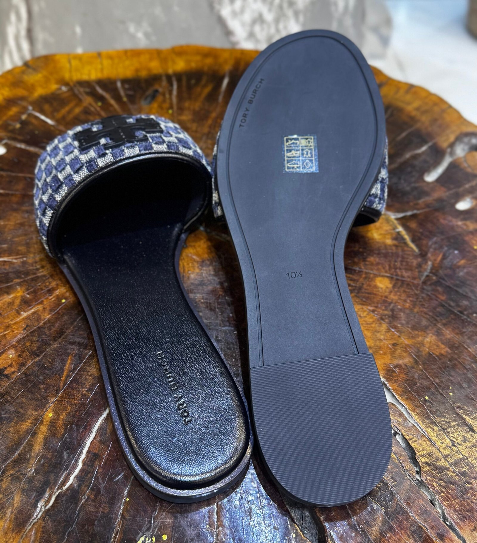 Design: This flat slide sandals featuring a wide strap across the foot. The strap prominently displays the iconic Tory Burch Double