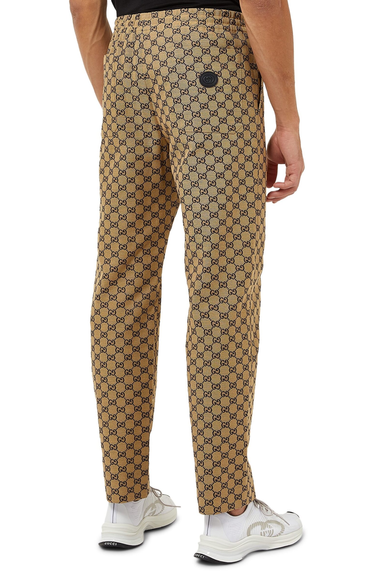 Features include a leather Interlocking G patch, elastic waistband with drawstring waist, front slant pockets, and back patch pockets.