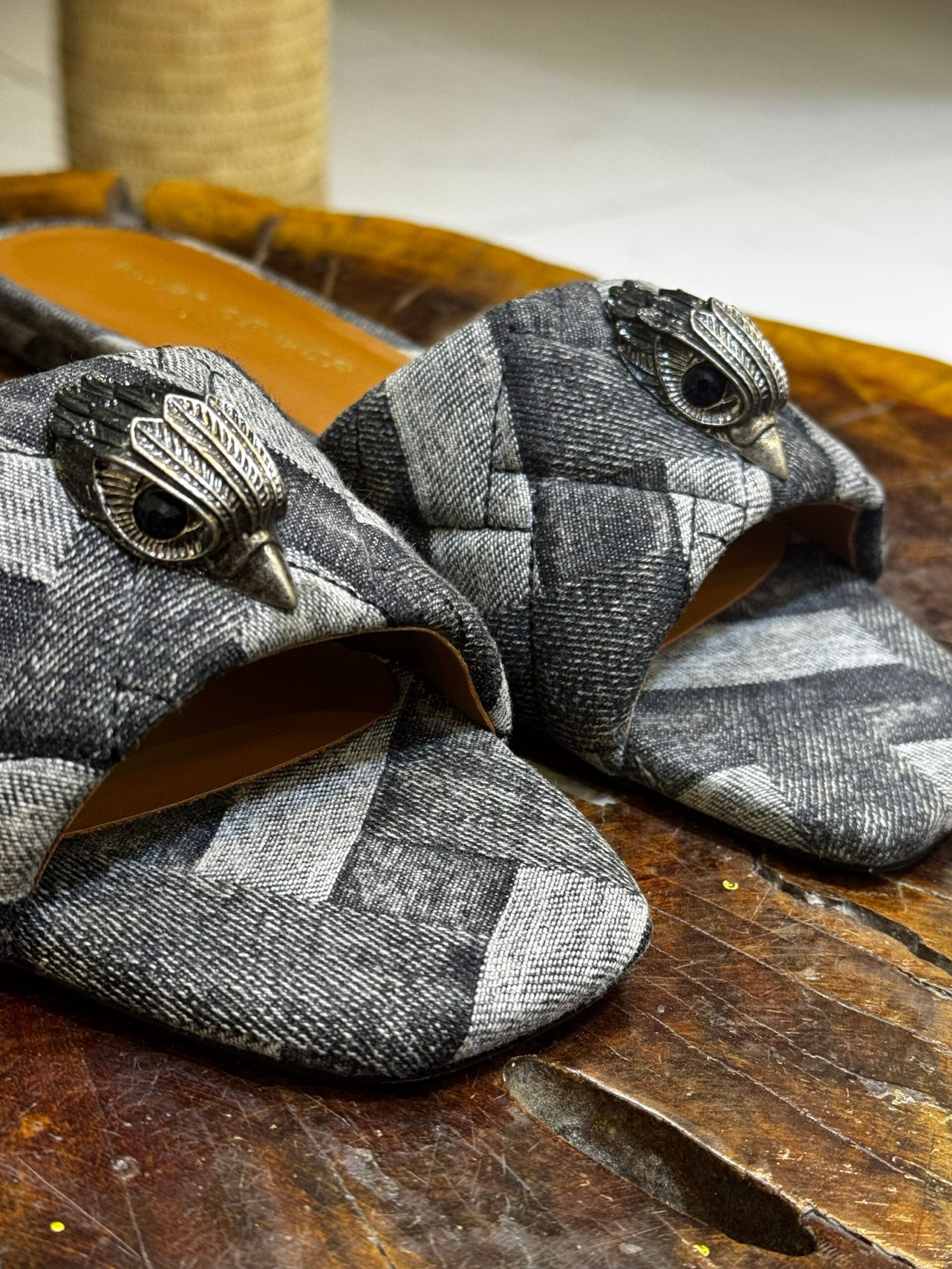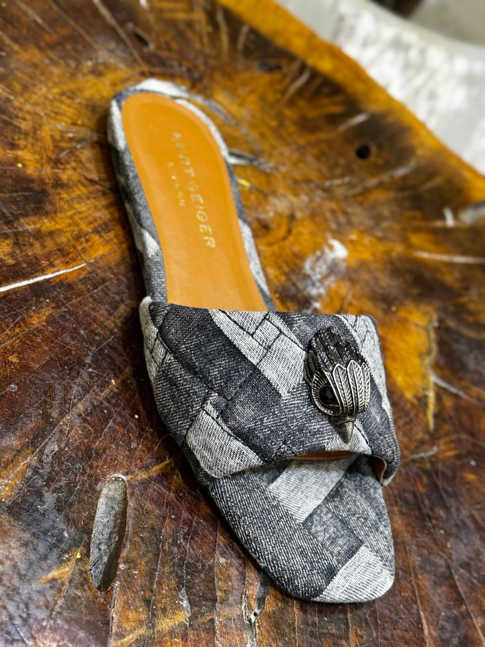 Crafted from acid-washed denim with a textured weave effect, these slip-on sandals feature the brand’s signature antique eagle head emblem on the front strap. They are designed with an open square toe and a flat sole for a casual yet elevated look.