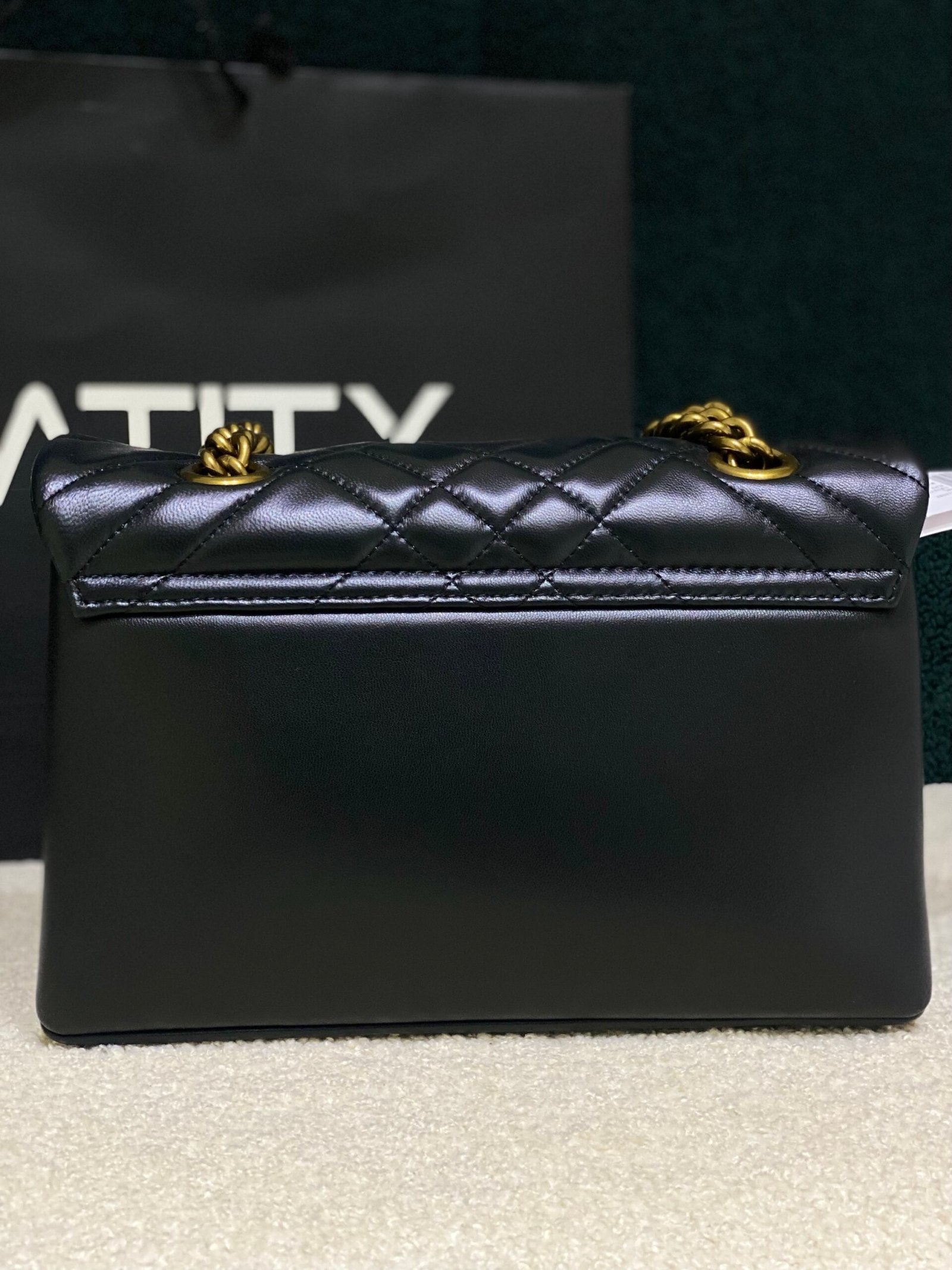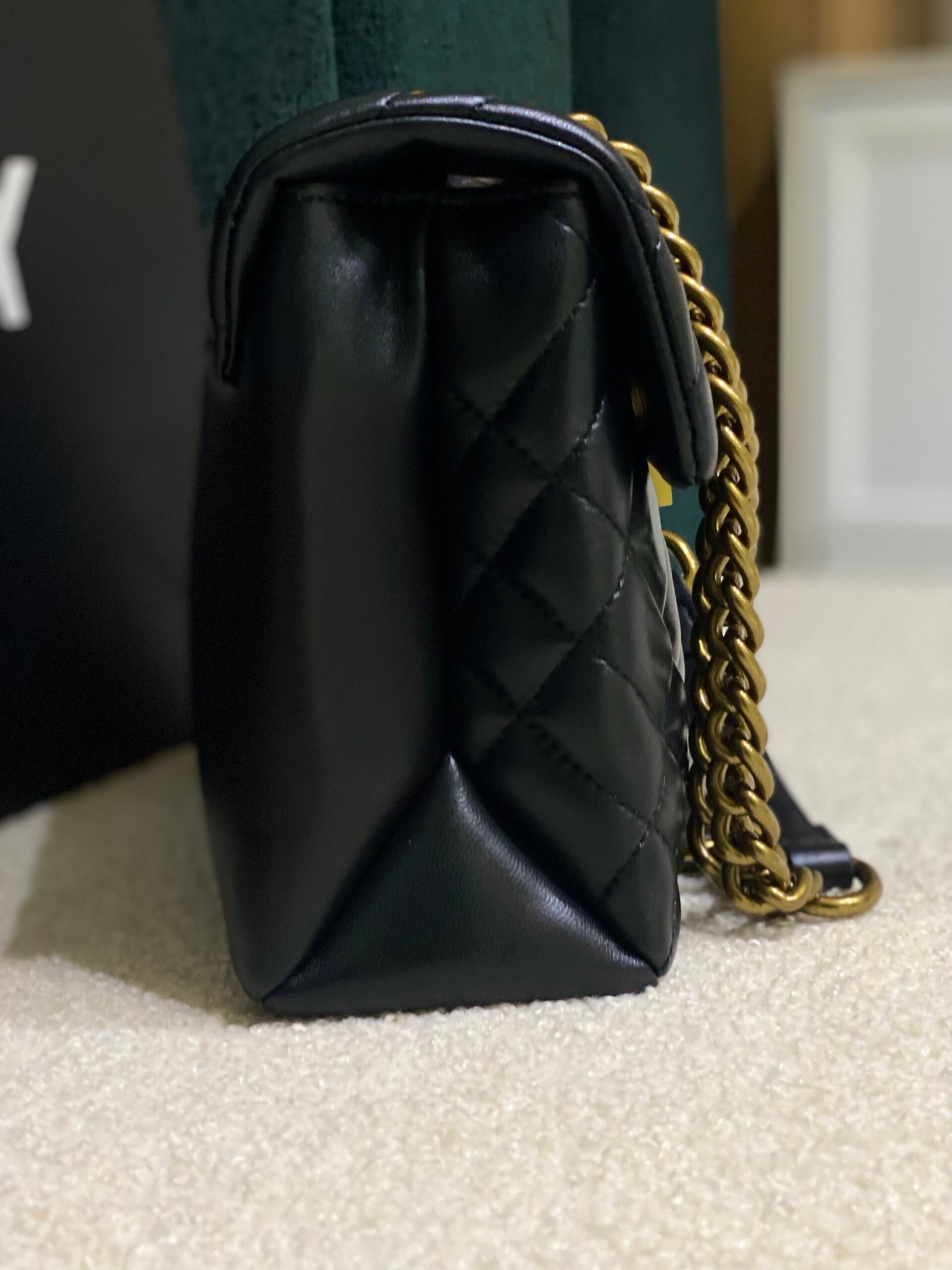 - Strap: Includes a versatile pull-through antiqued brass chain strap that can be worn as a shoulder or crossbody bag.