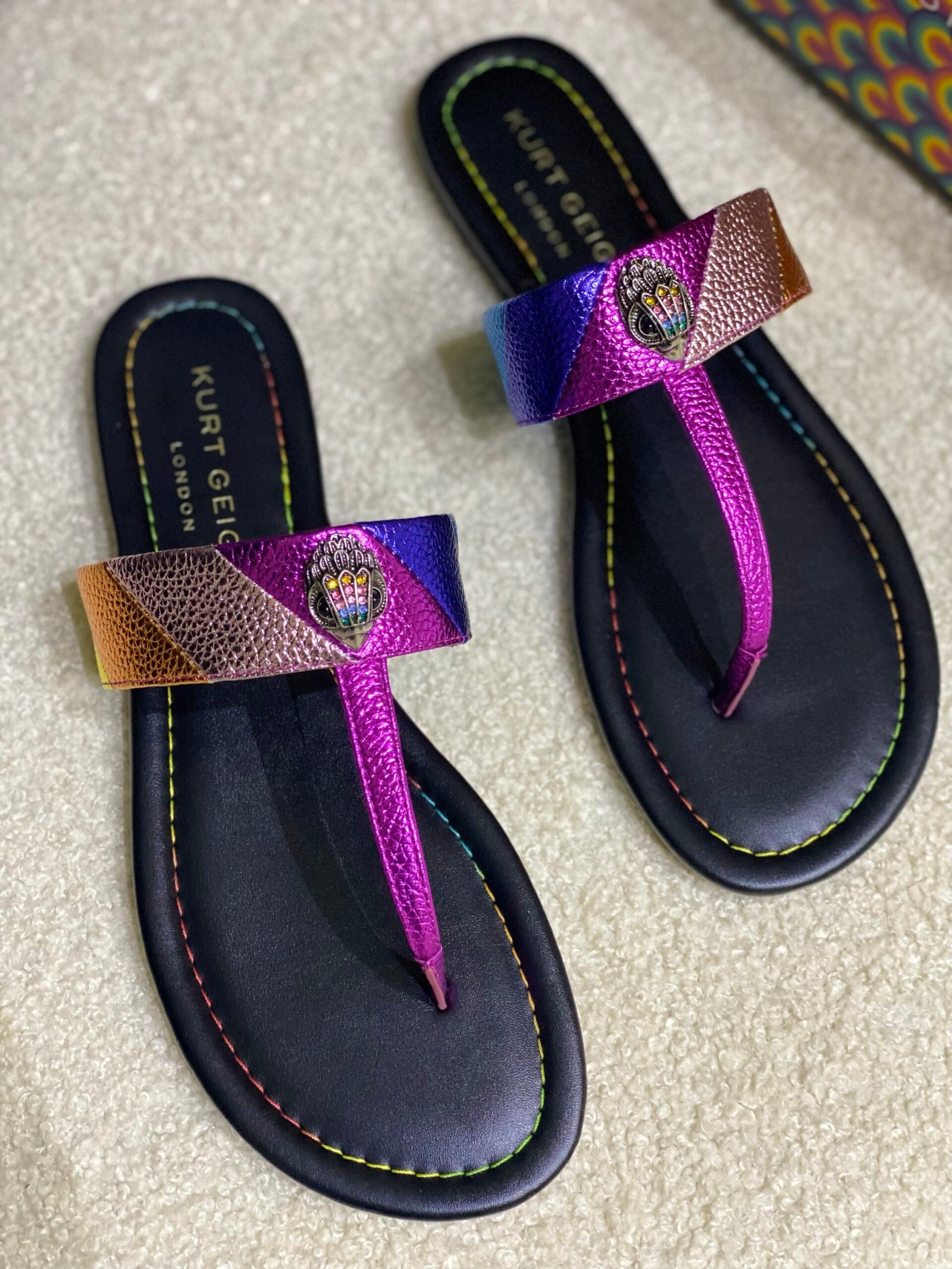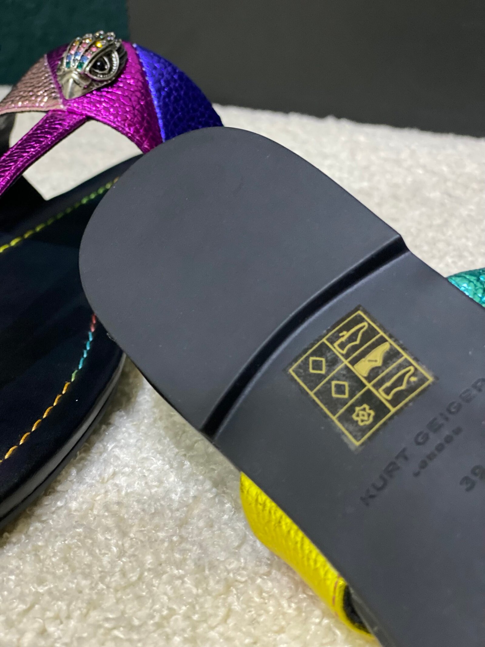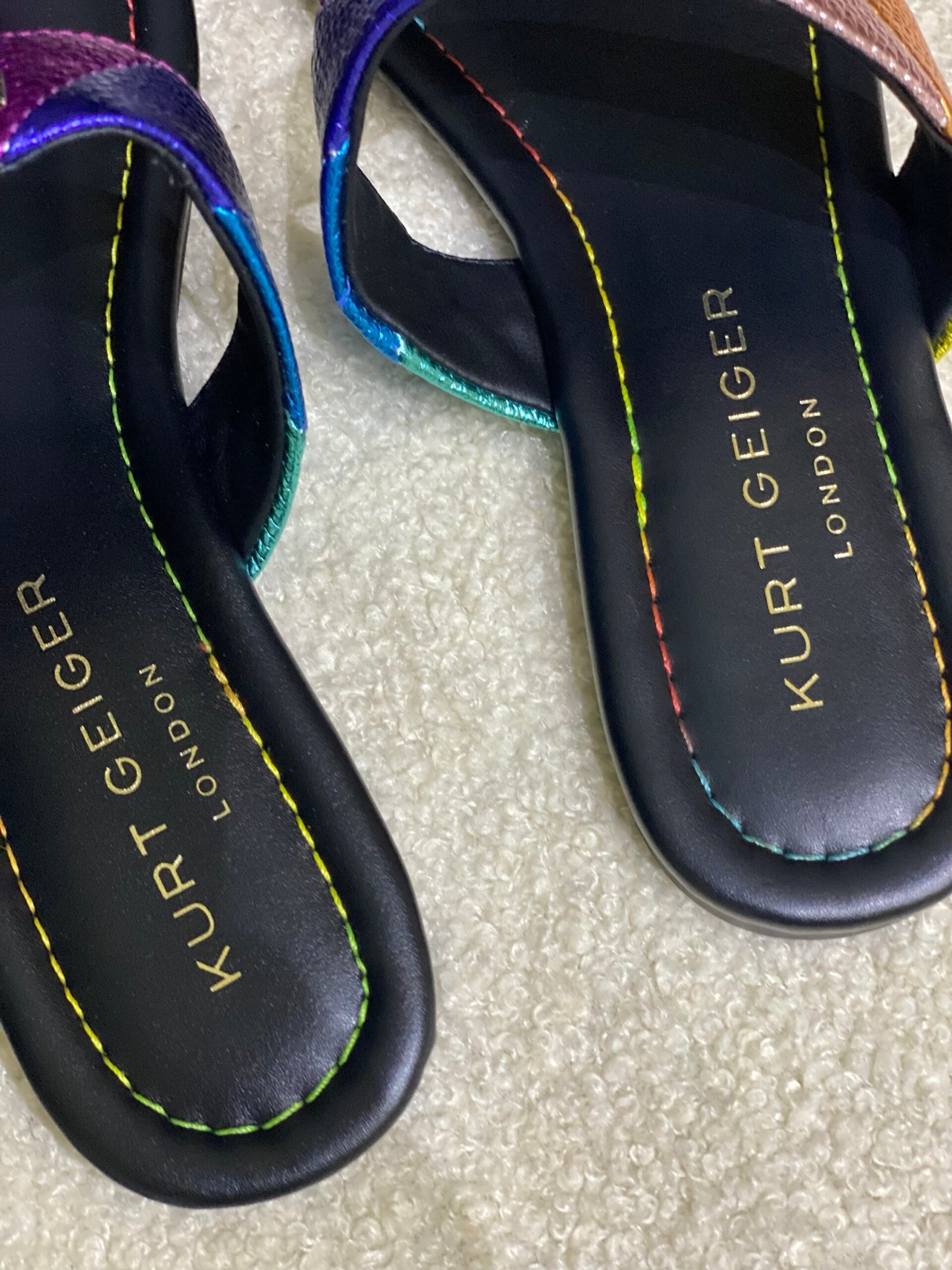 Be the first to review “Kurt Geiger London Kensington T-Bar Sandal, a signature style known for its vibrant metallic design and iconic embellishments.” Cancel reply
