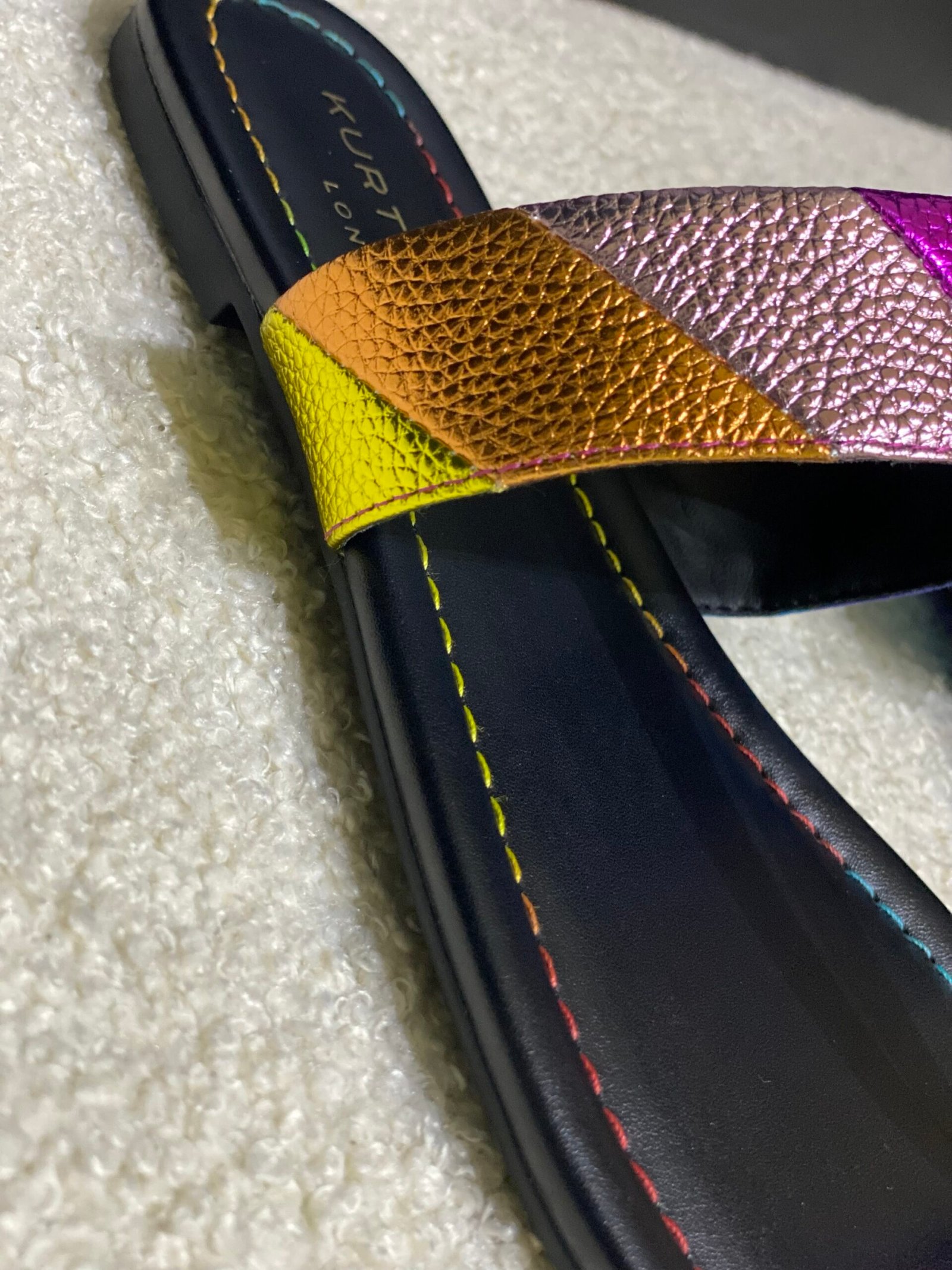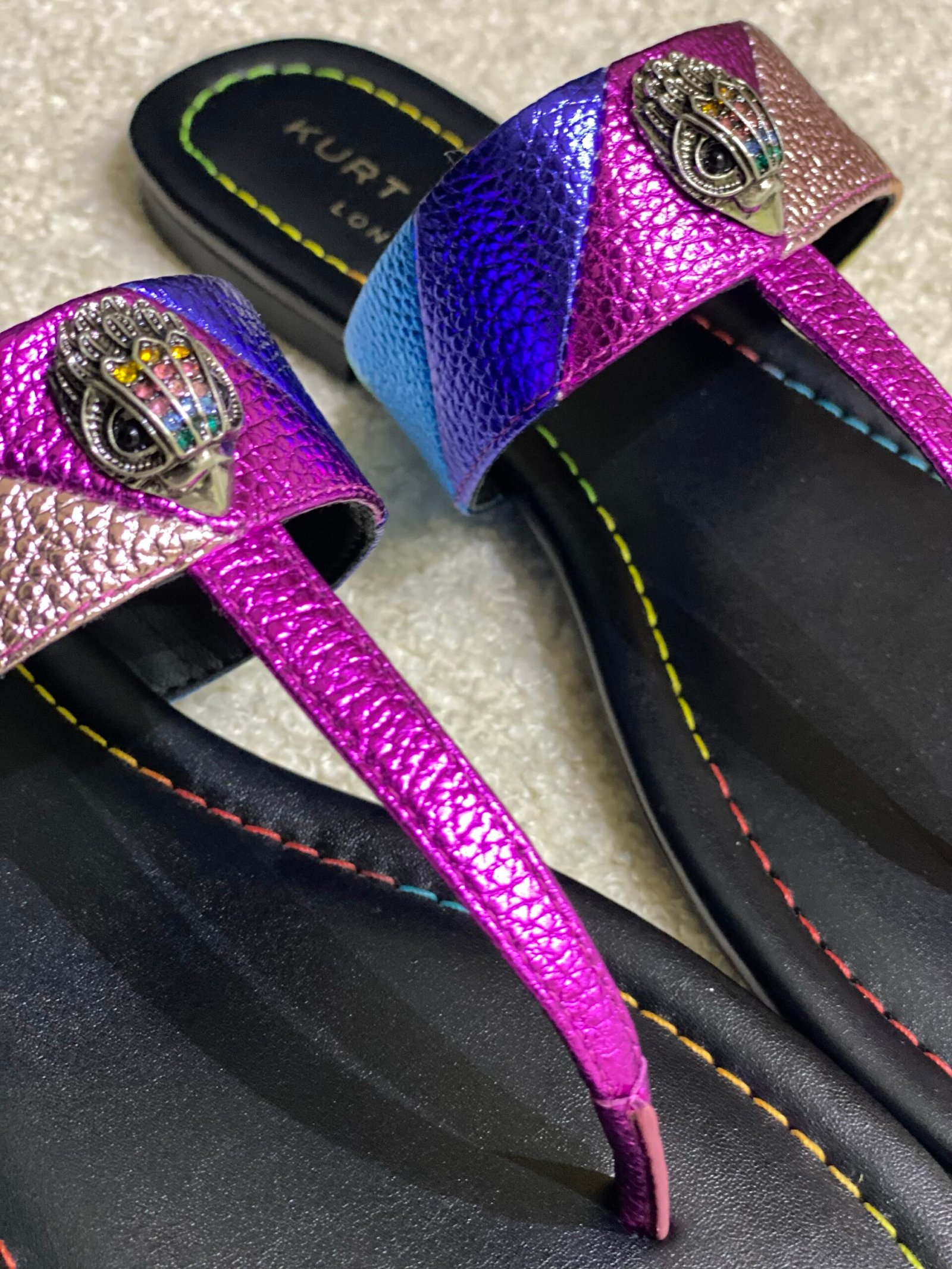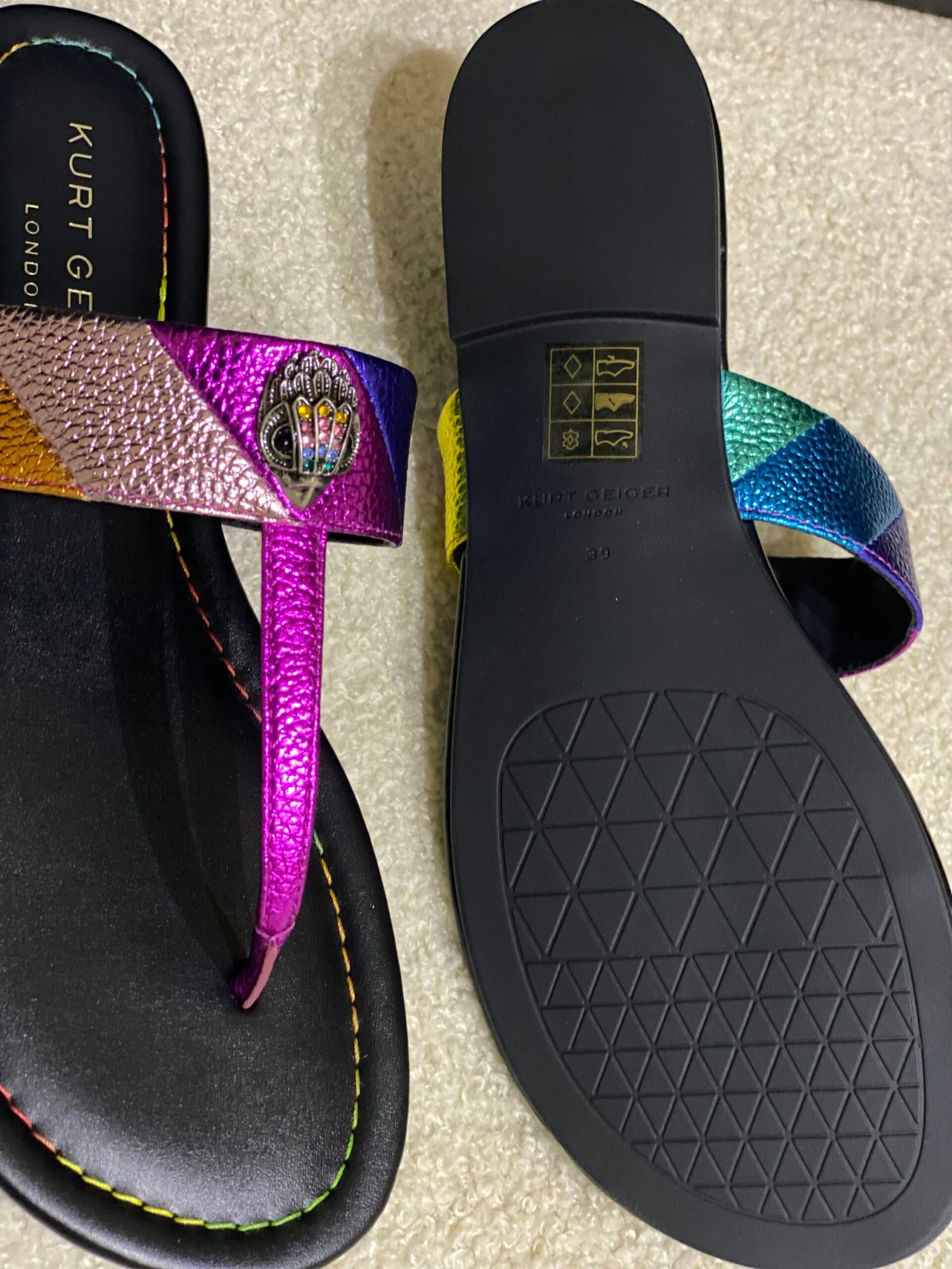 Be the first to review “Kurt Geiger London Kensington T-Bar Sandal, a signature style known for its vibrant metallic design and iconic embellishments.” Cancel reply