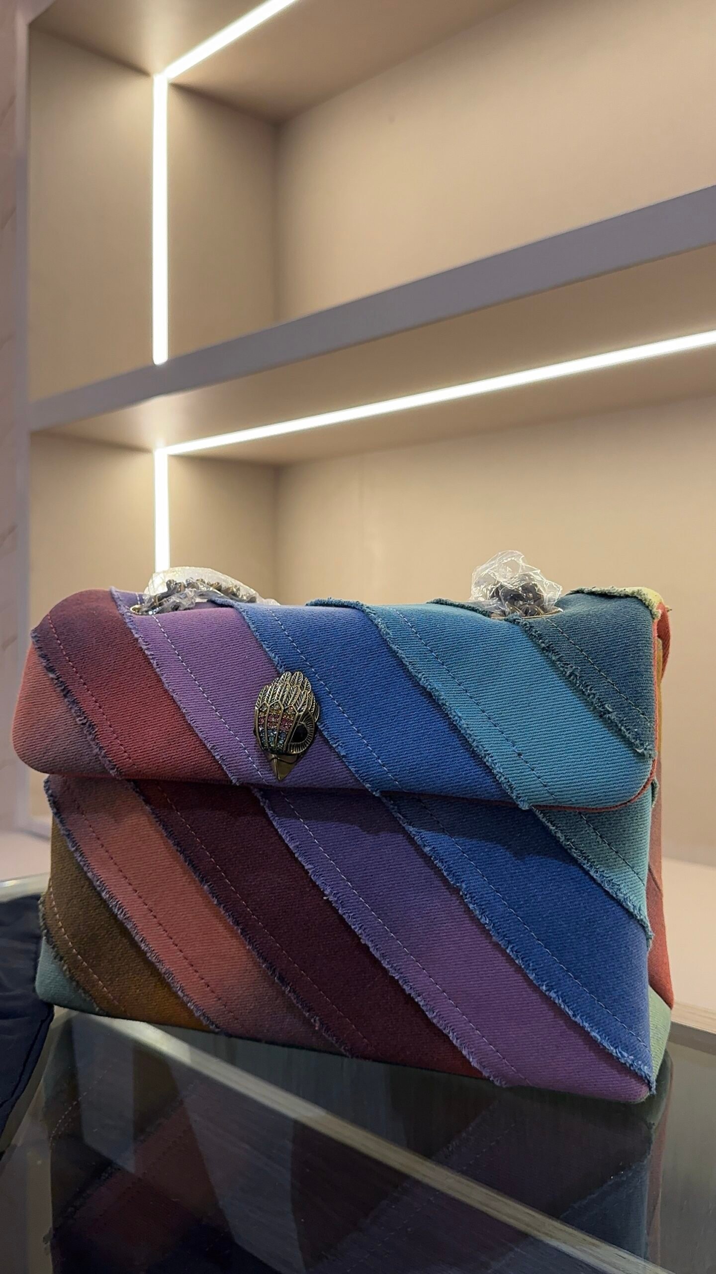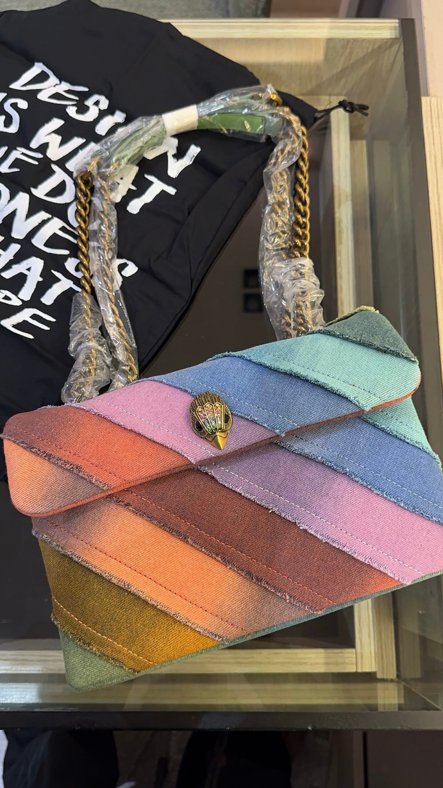 The Denim Mini Kensington bag is crafted from a washed rainbow denim in a frayed stripe design. The antique brass eagle head features rainbow crystals on the front flap.