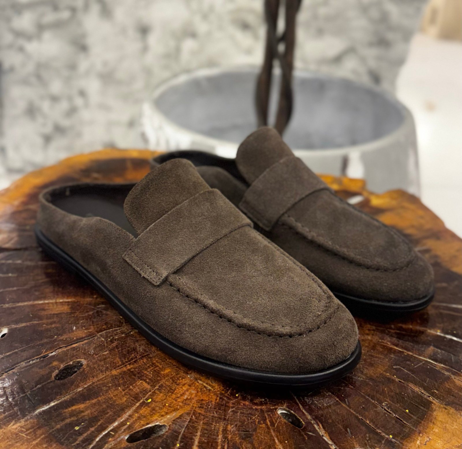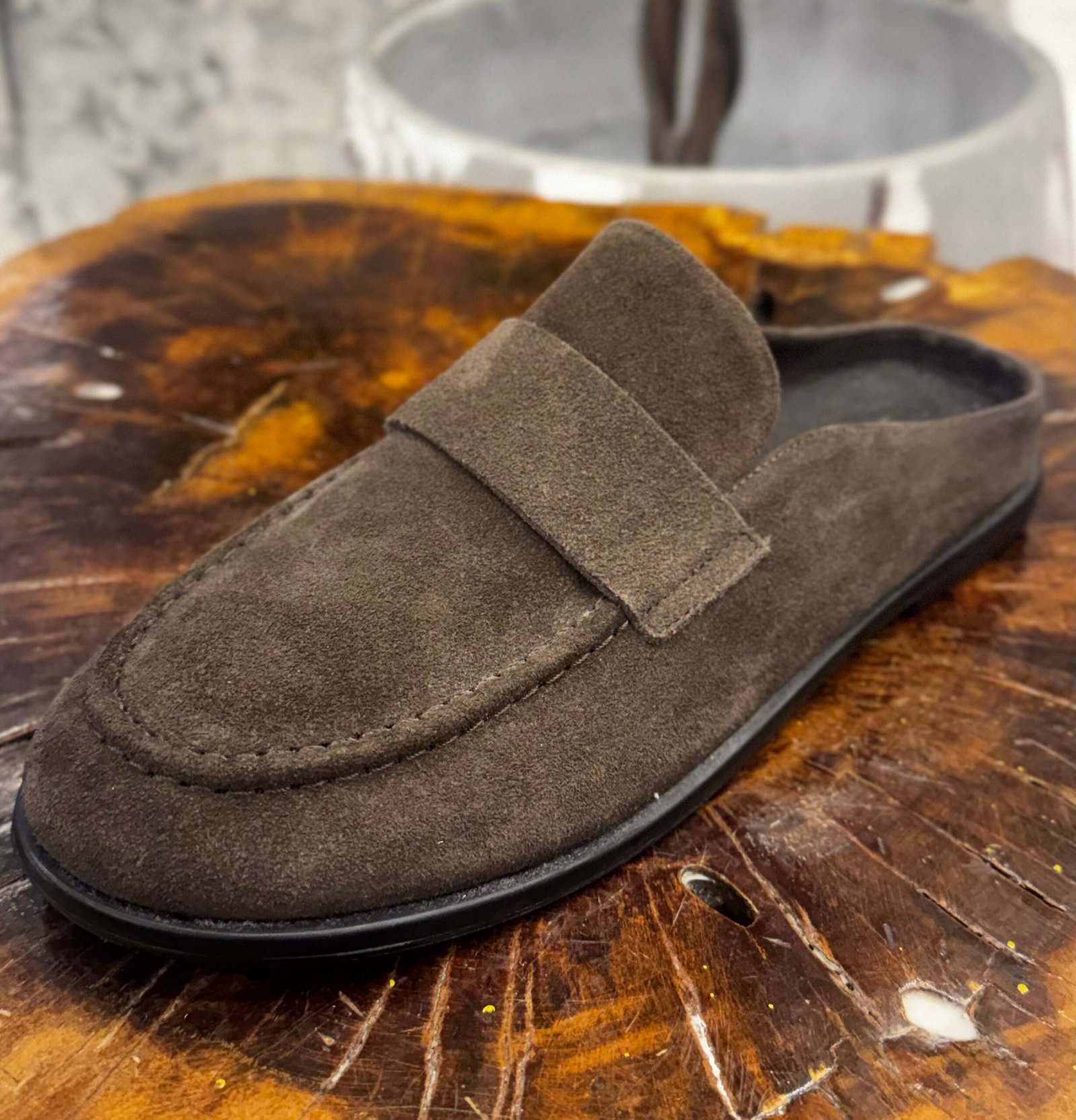 Mule loafers made of split suede leather. Penny strap detail on the instep. Round toe. Tonal sole with a slight heel.