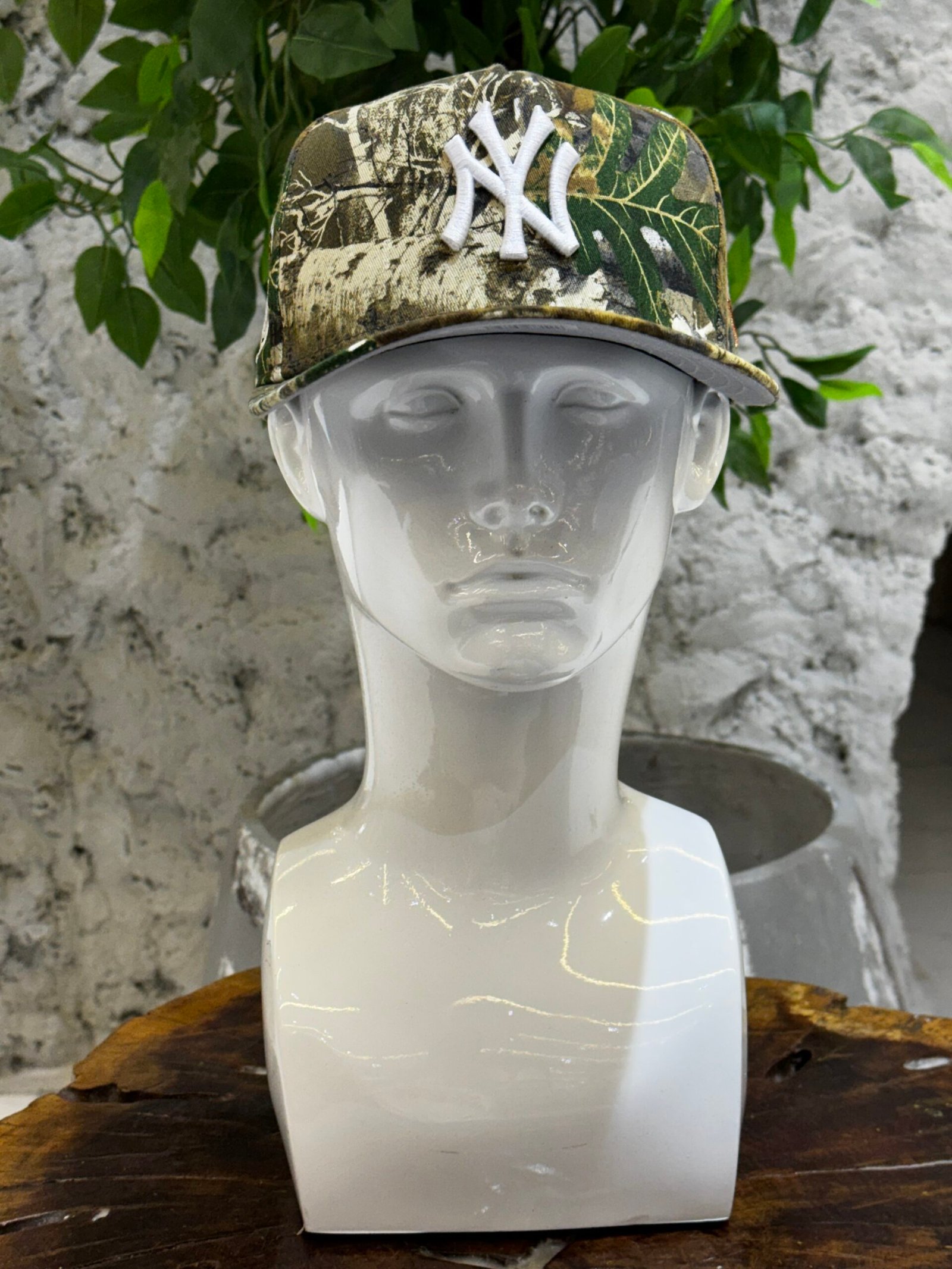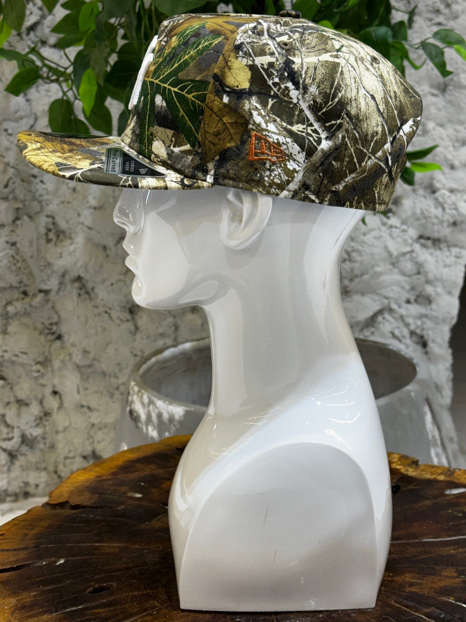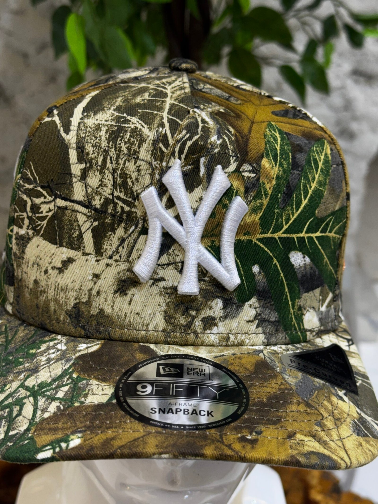 This is a New Era 9FIFTY A-Frame SnapBack featuring an all-over Realtree camouflage print and an embroidered New York Yankees logo. It has a structured single front panel for a modern, angular profile and an adjustable plastic closure.