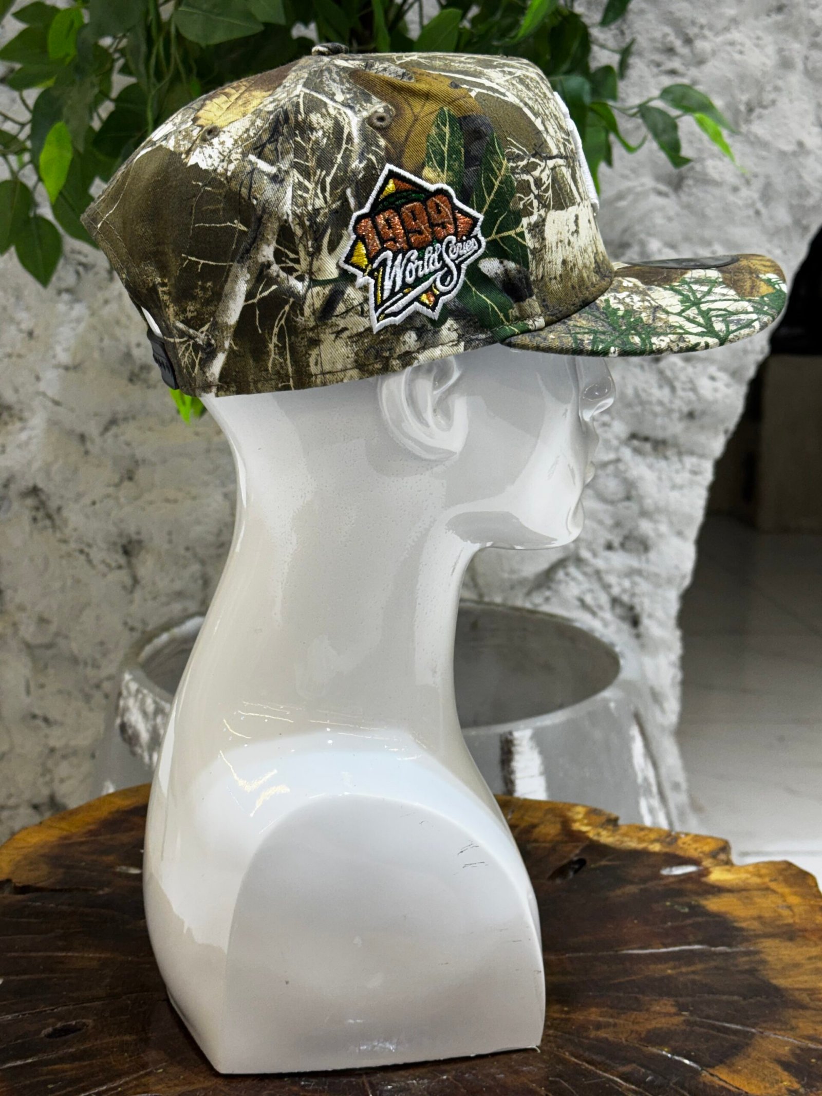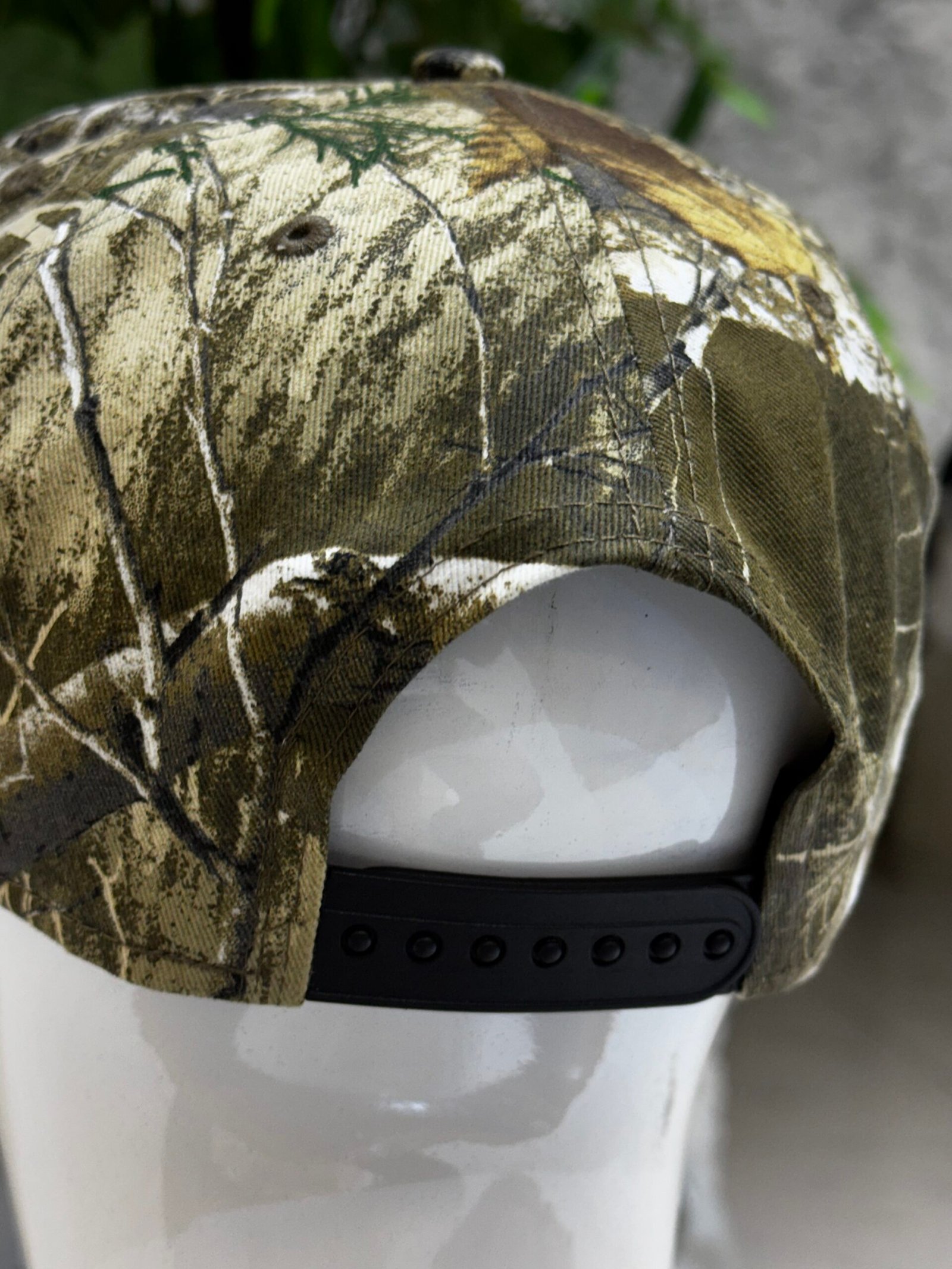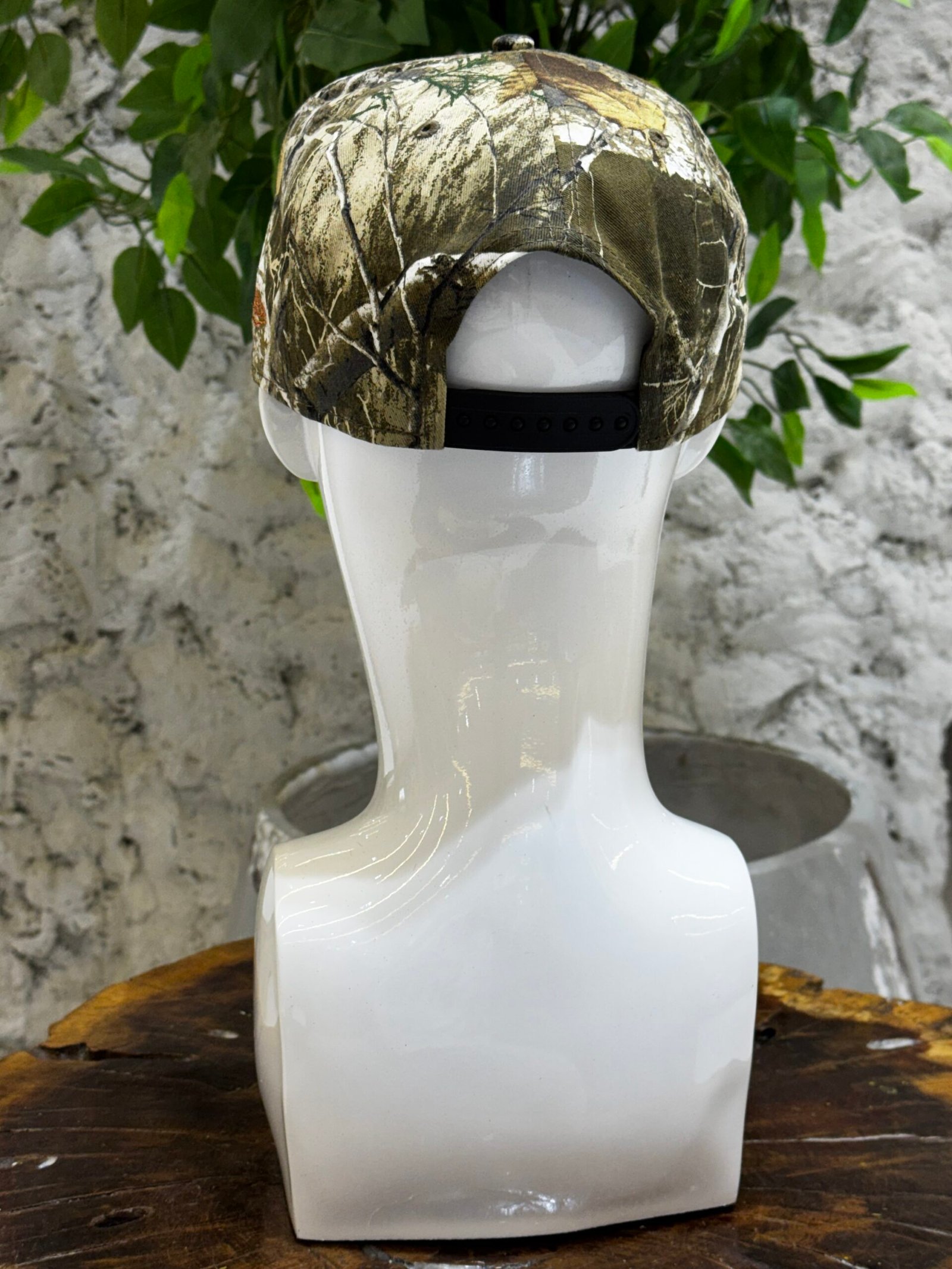 This is a New Era 9FIFTY A-Frame SnapBack featuring an all-over Realtree camouflage print and an embroidered New York Yankees logo. It has a structured single front panel for a modern, angular profile and an adjustable plastic closure.