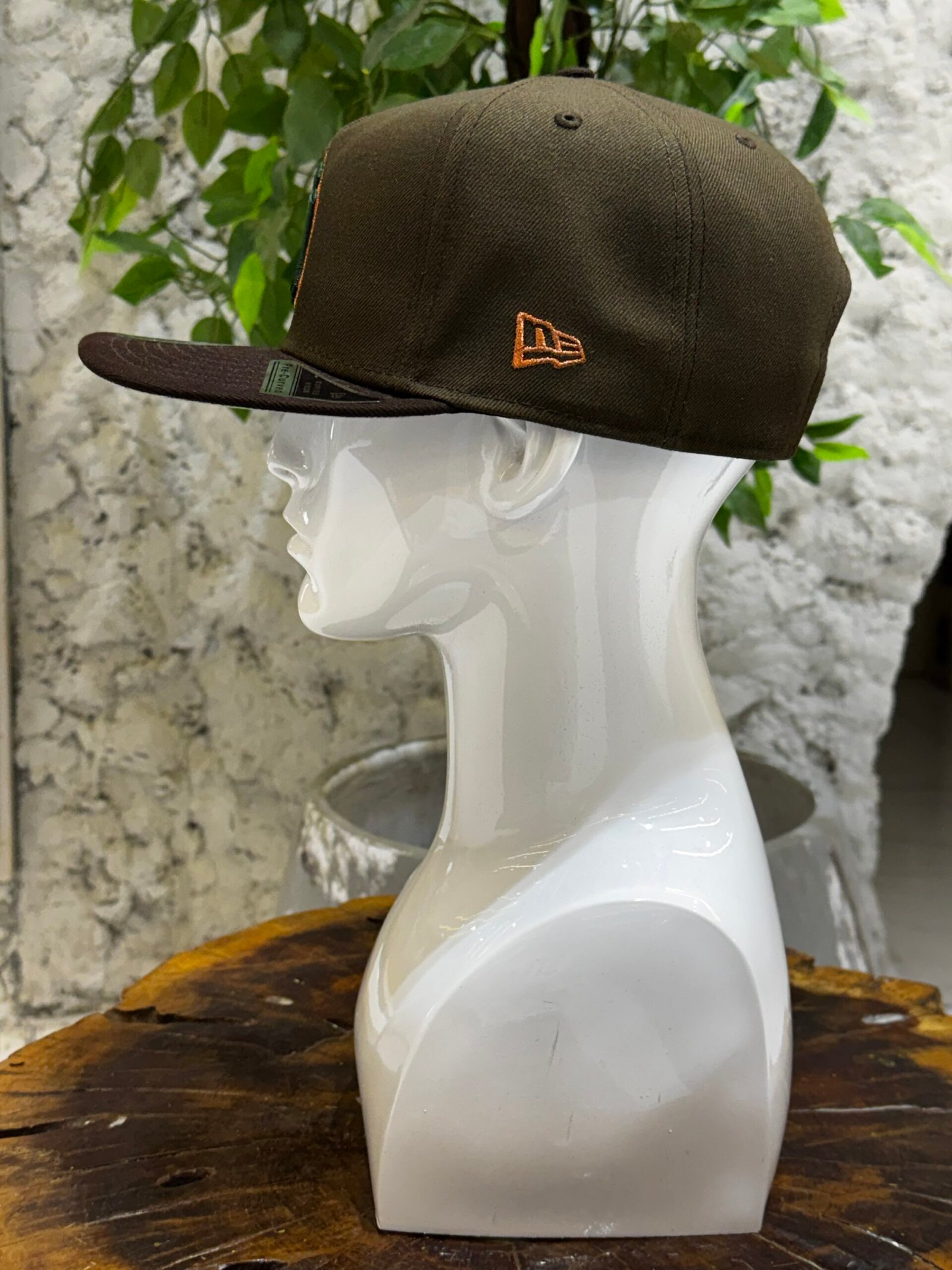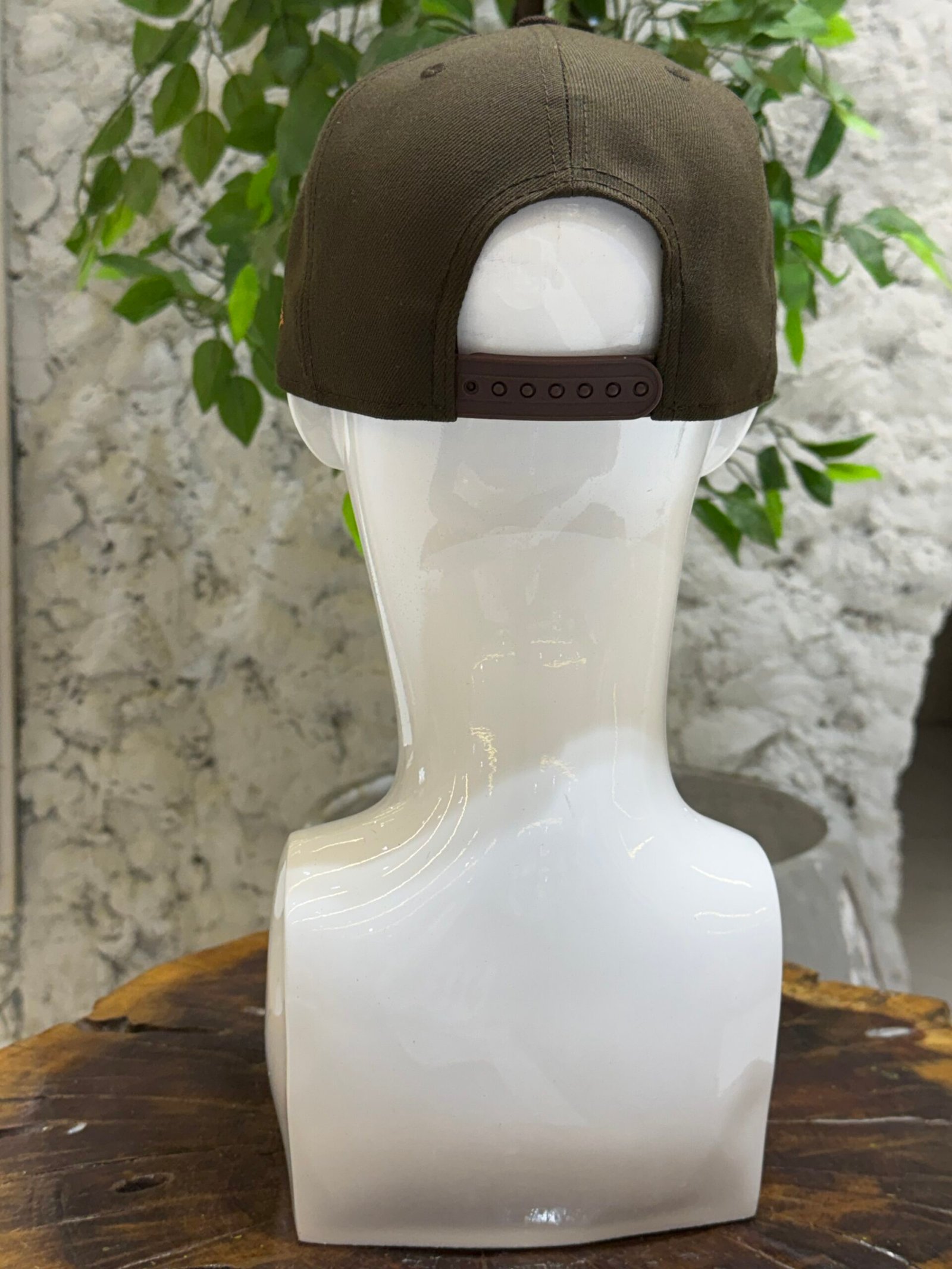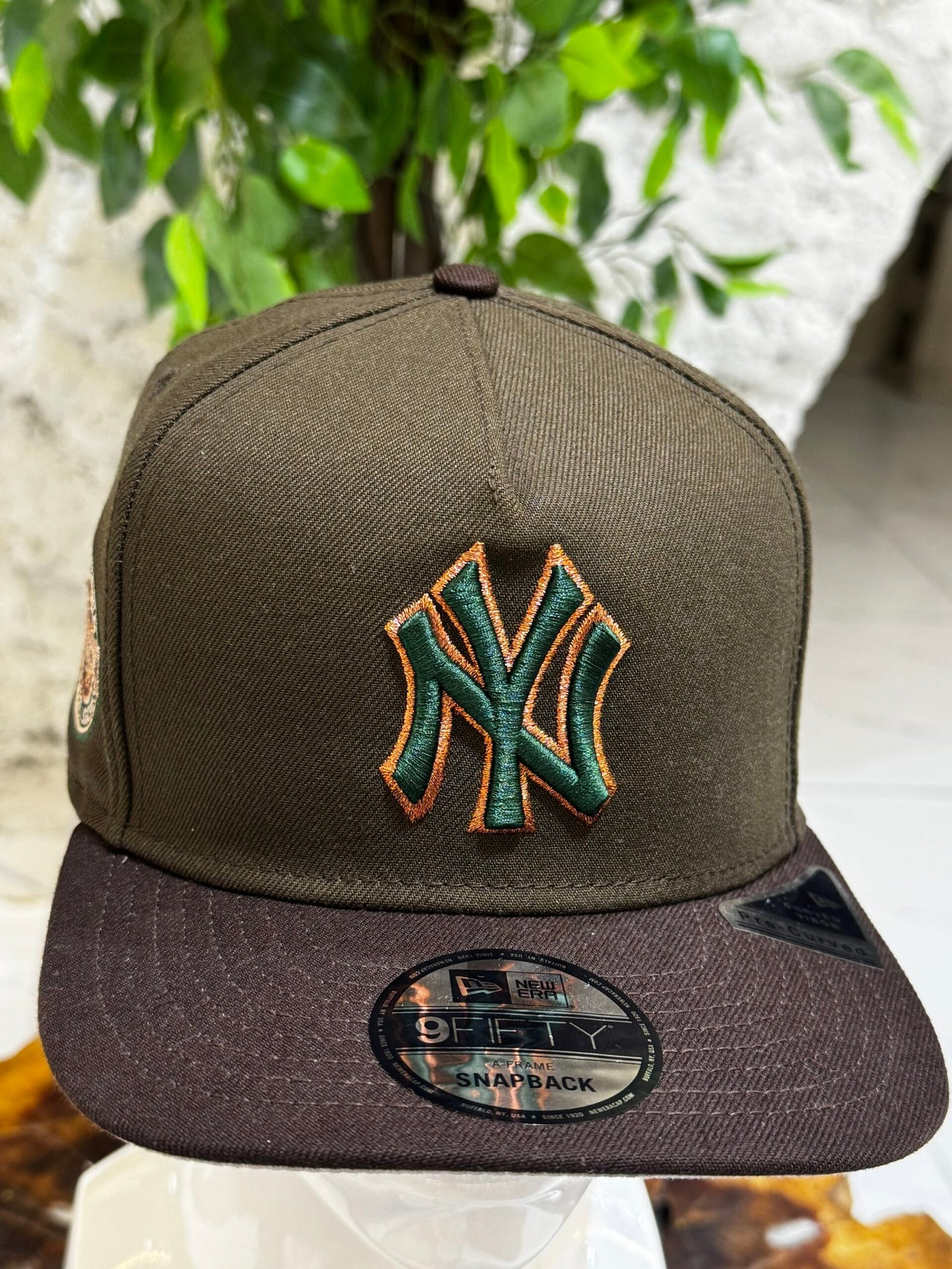 This is a New Era New York Yankees 9FIFTY A-Frame Snapback in a “Beef & Broccoli” inspired colorway. It features a dark brownstructured crown, a curved brim, and a 5-panel high-profile “pinched” front. The Yankees logo is finished in dark green with a metallic copper-orange outline, and the hat includes a commemorative side patch.