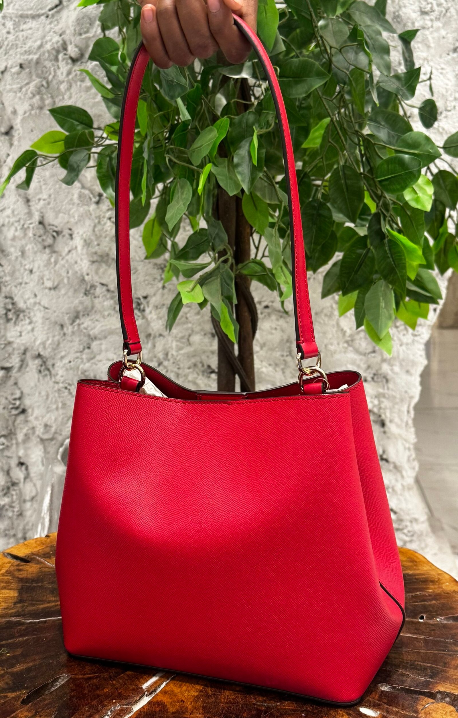 - Design: This bucket-style bag features a snap closure and a slim middle zip compartment that divides the interior.