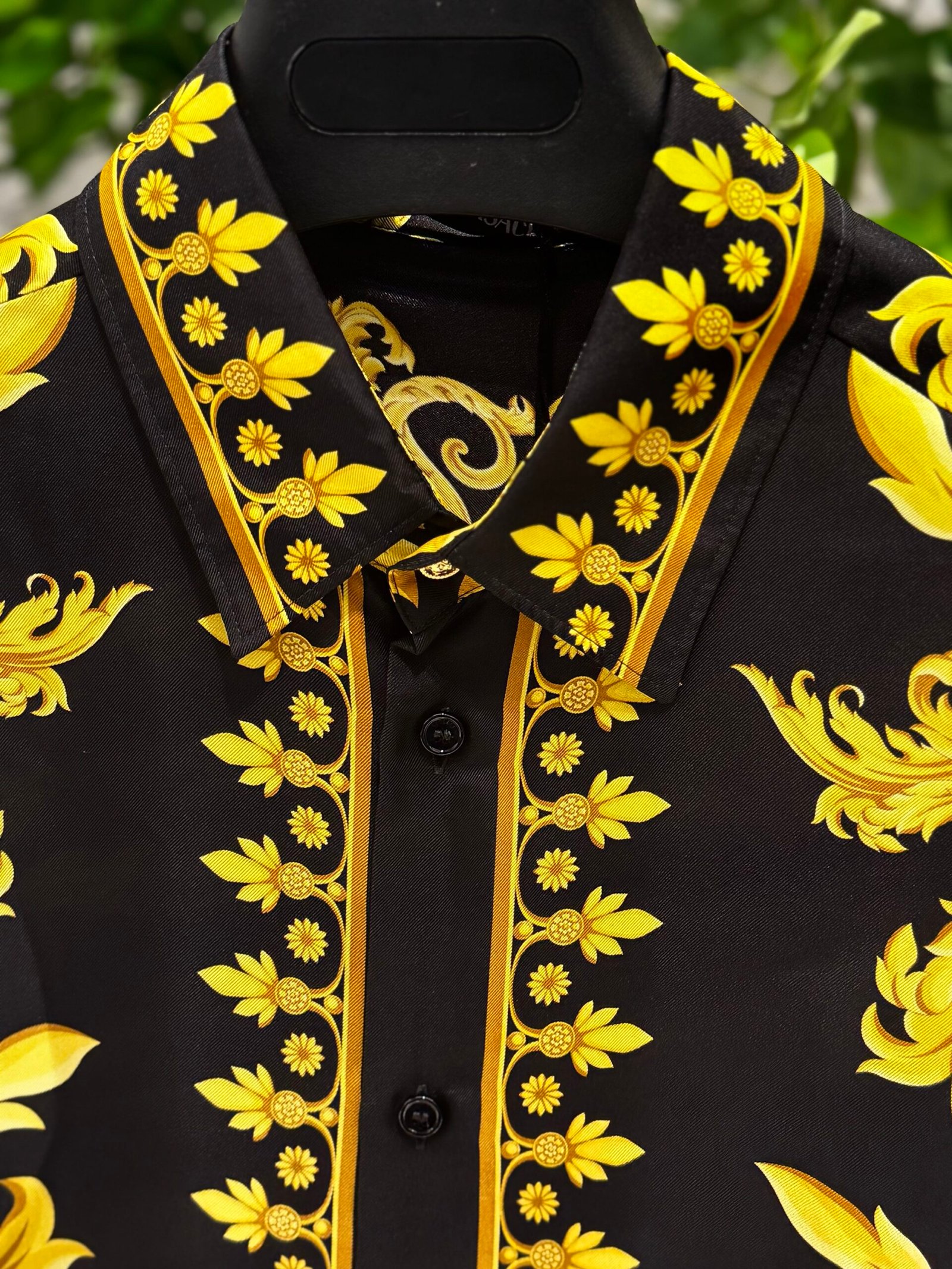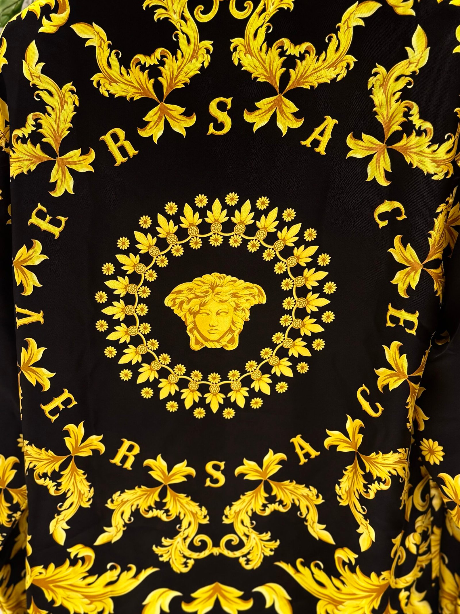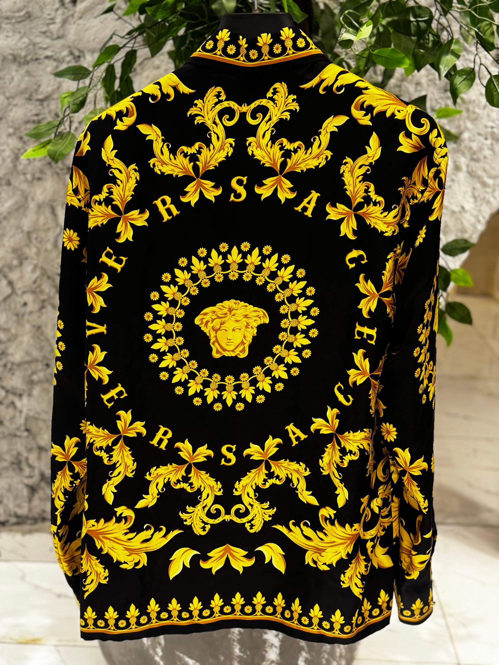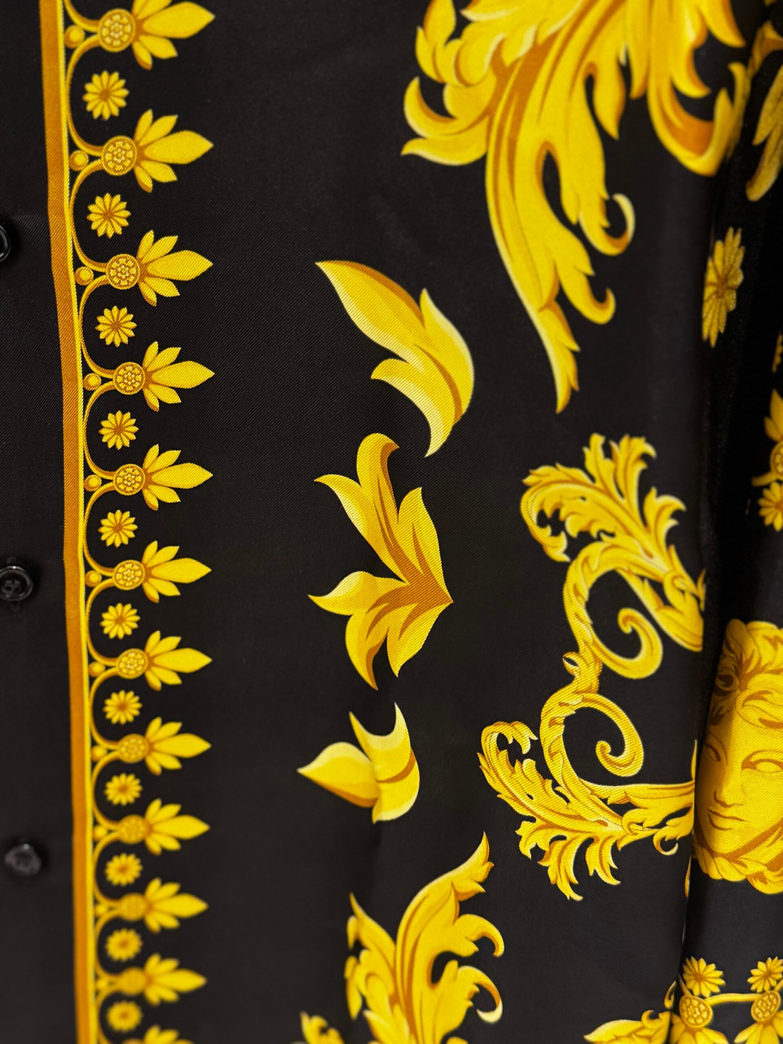 It features the brand’s iconic gold Barocco print against a black background. The design is finished with a point collar and buttoned cuffs, often including a single Medusa button at the collar.