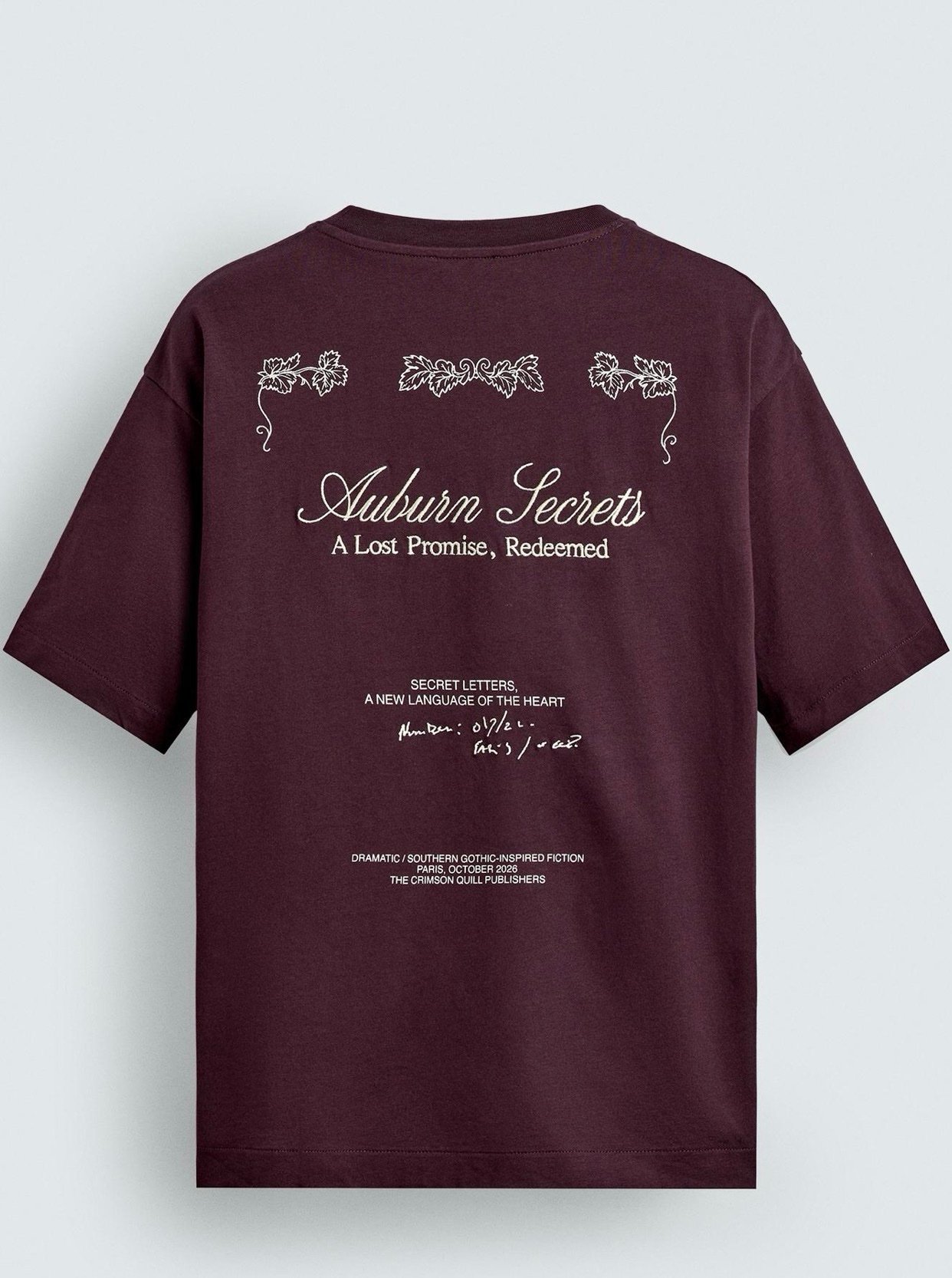 Zara men’s maroon cotton round neck T-shirt features a small white printed slogan “A Forbidden Love, Rekindled.” on the left chest.