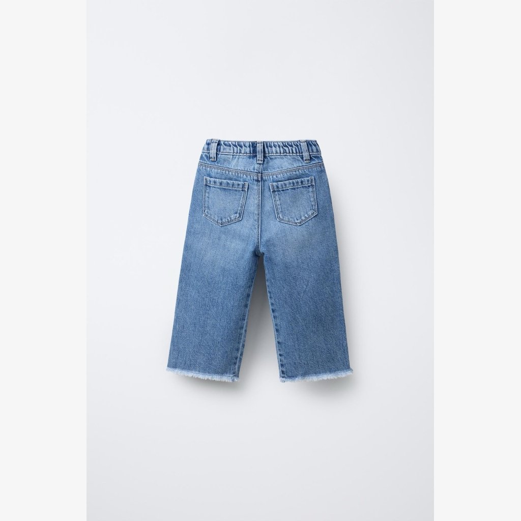 Culotte jeans with an elastic waistband and front snap-button fastening. Front pockets with heart appliqués, patch pockets on the back