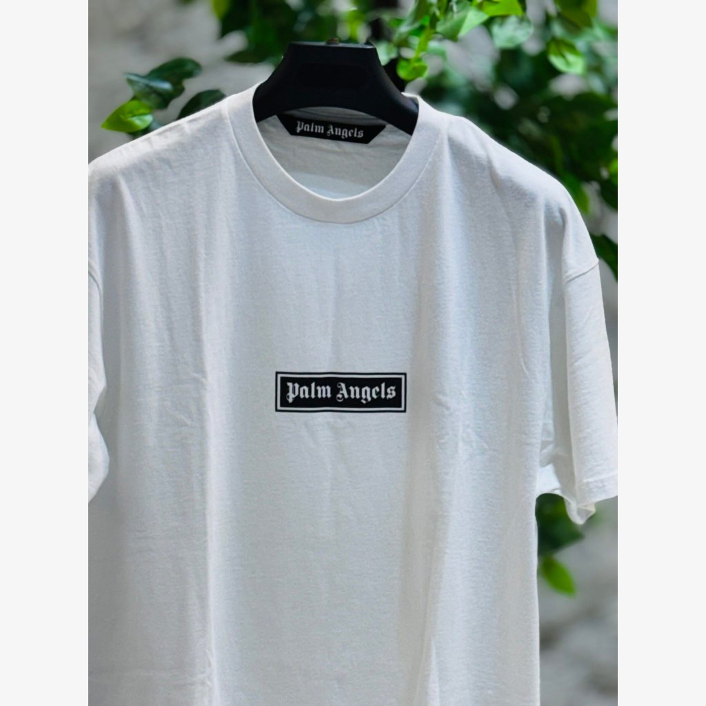 The t-shirt features a black rectangular logo with the brand name “Palm Angels” in a white, Gothic-style font on the